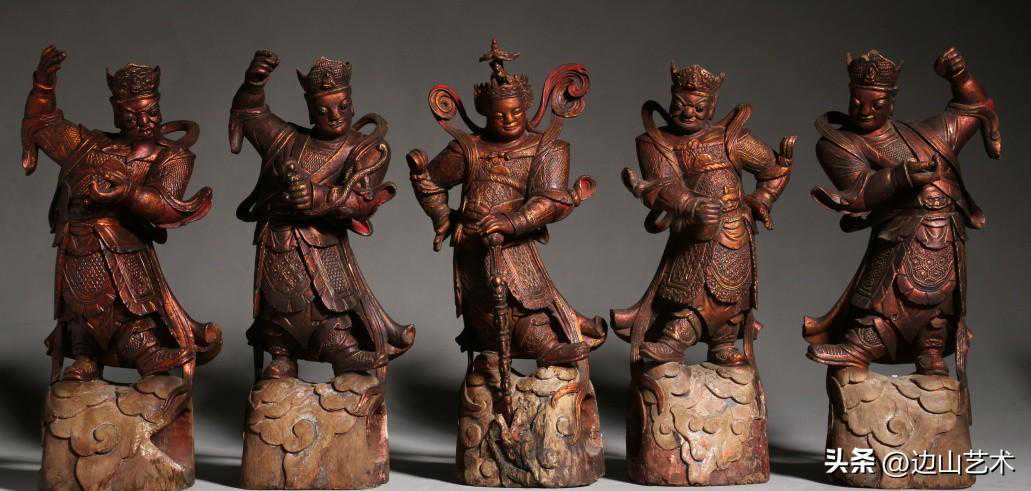 四大天王与韦驮组像明早期晋作木漆金50-52cm为同时期、同匠师、同地供奉,极其难得边山艺术收藏