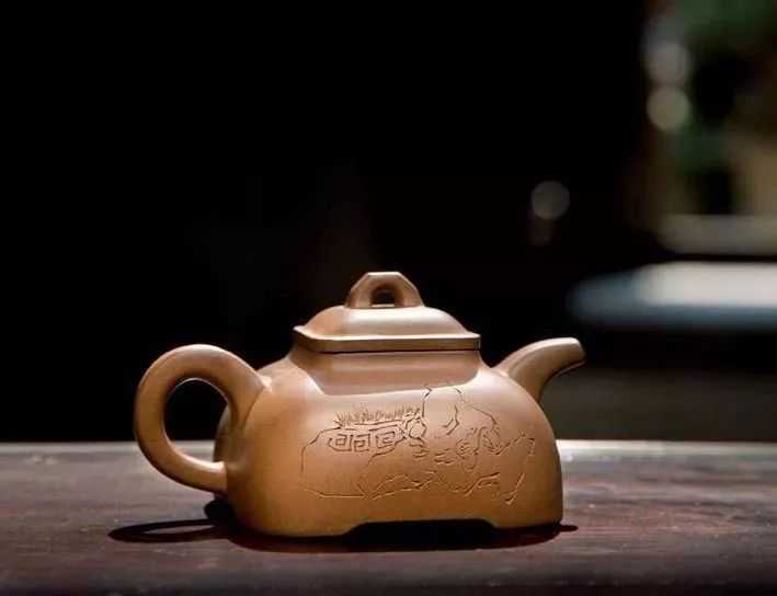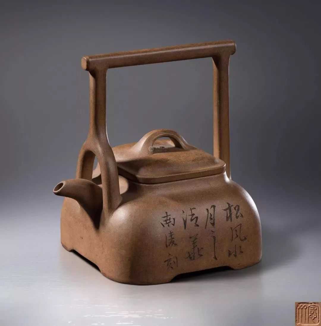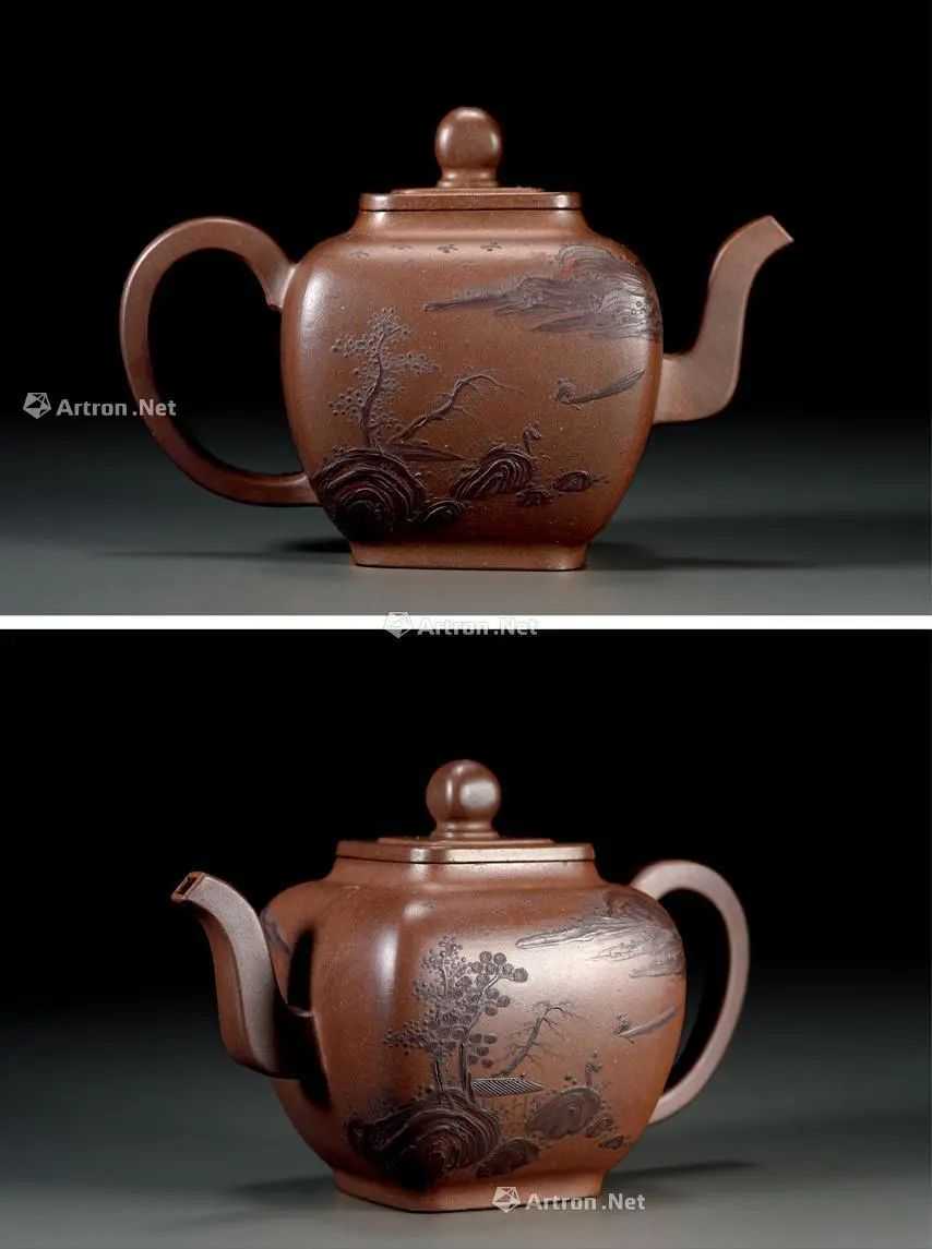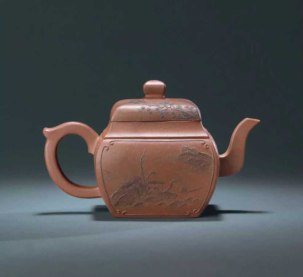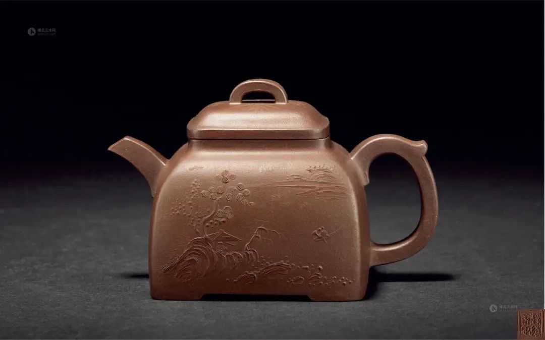 此壶作四方鼓腹式,方中带圆。壶身以深色泥料堆绘“秋江晚渡”图,只见浩瀚江面,渡船徐徐,老者倚仗而望,远处山峦层迭,秋雁晚归,给人以静谧祥和之感。
