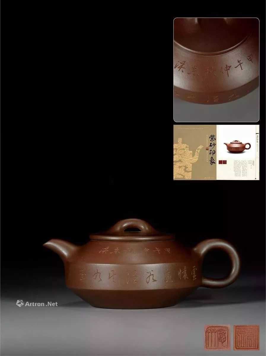 此壶造型方中寓圆,刚柔相济。泥料细润沉稳,器身一面以黑色脂泥堆绘开窗纹样,内堆绘诗文一首,字迹隽秀,另一面堆绘山水图,层次分明,技法娴熟,意境深远。为黑堆泥装饰技法与紫砂壶完美结合的典范。