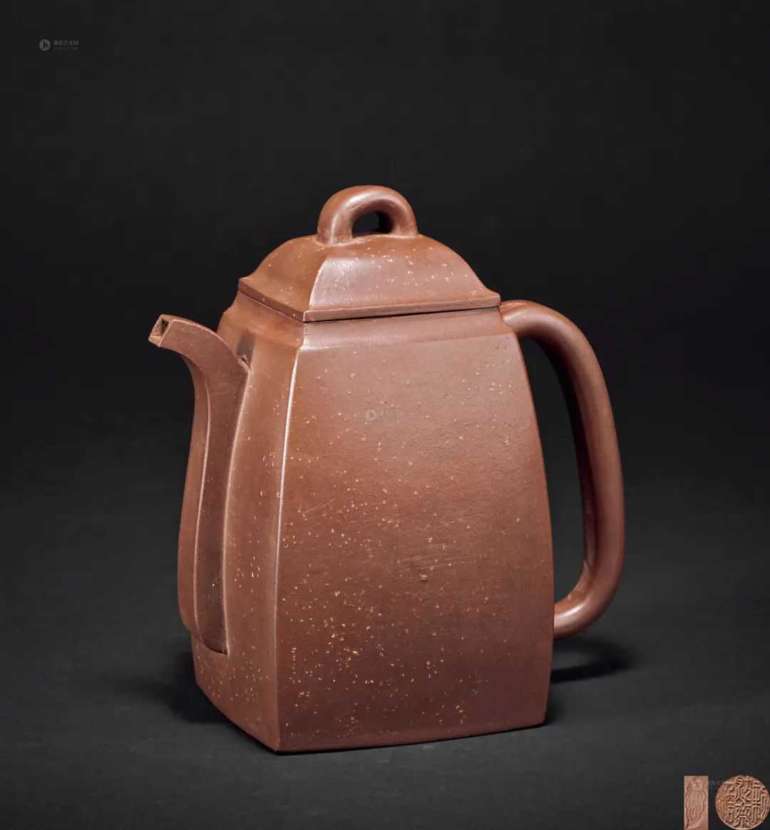 汉方壶式,流行于康雍干时期,多作大壶,壶身呈长方,四片相接部分绫线突出,以镶身筒成型法参砂制作成型,流把修长,整体壮硕大气,雄浑肃穆。沙粒隐现均匀密布,更显迷人。壶底镌篆书圆印“澹然斋制”,把上钤叶形印章。