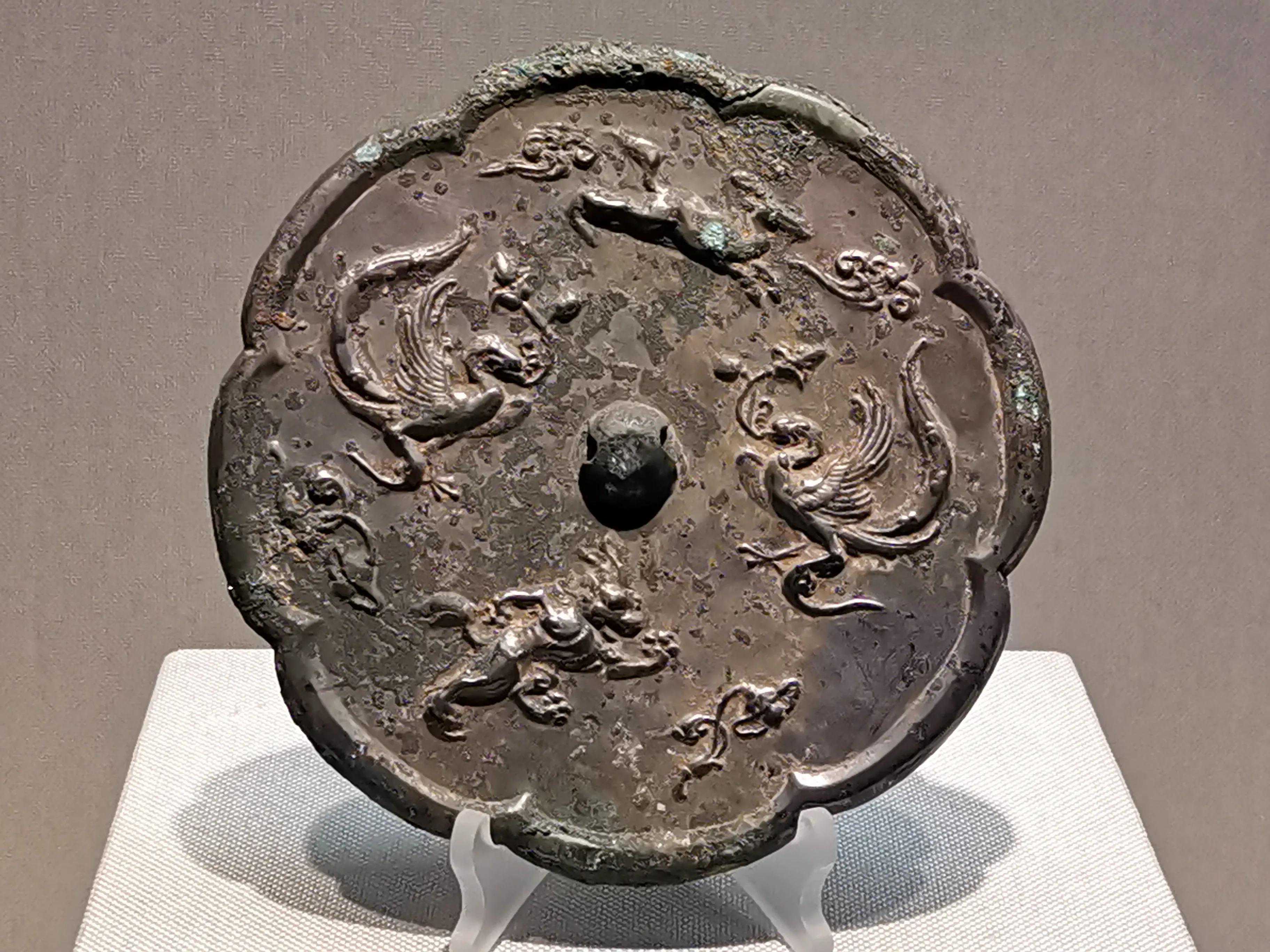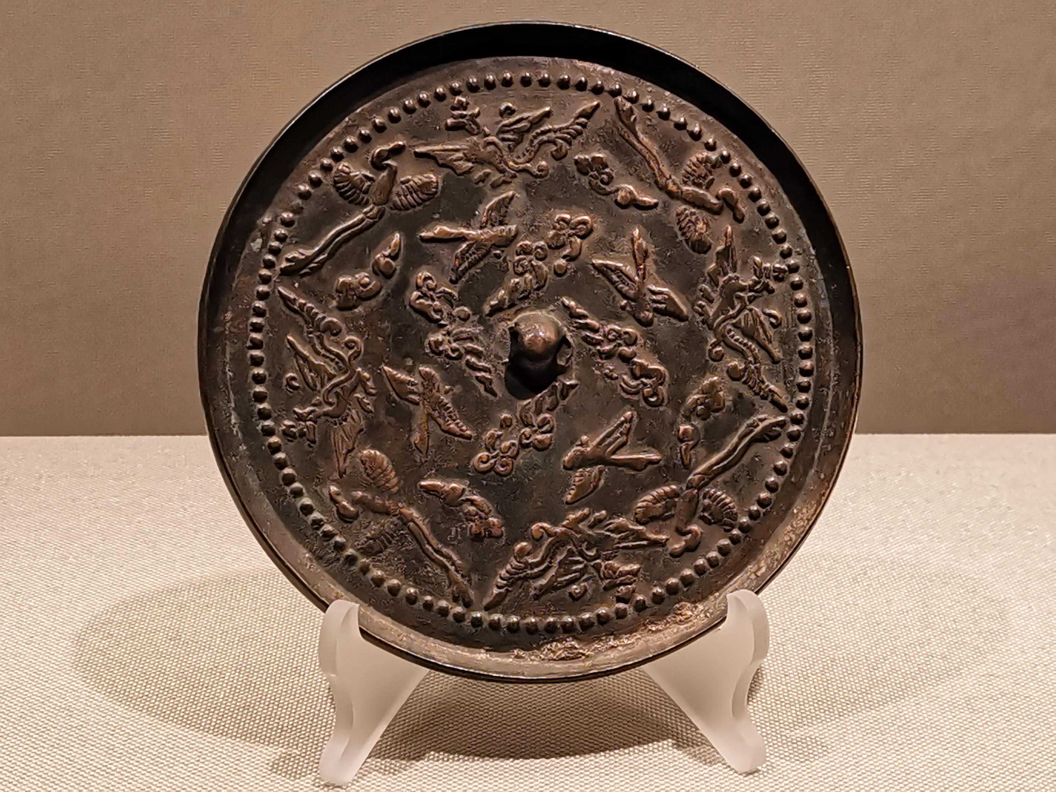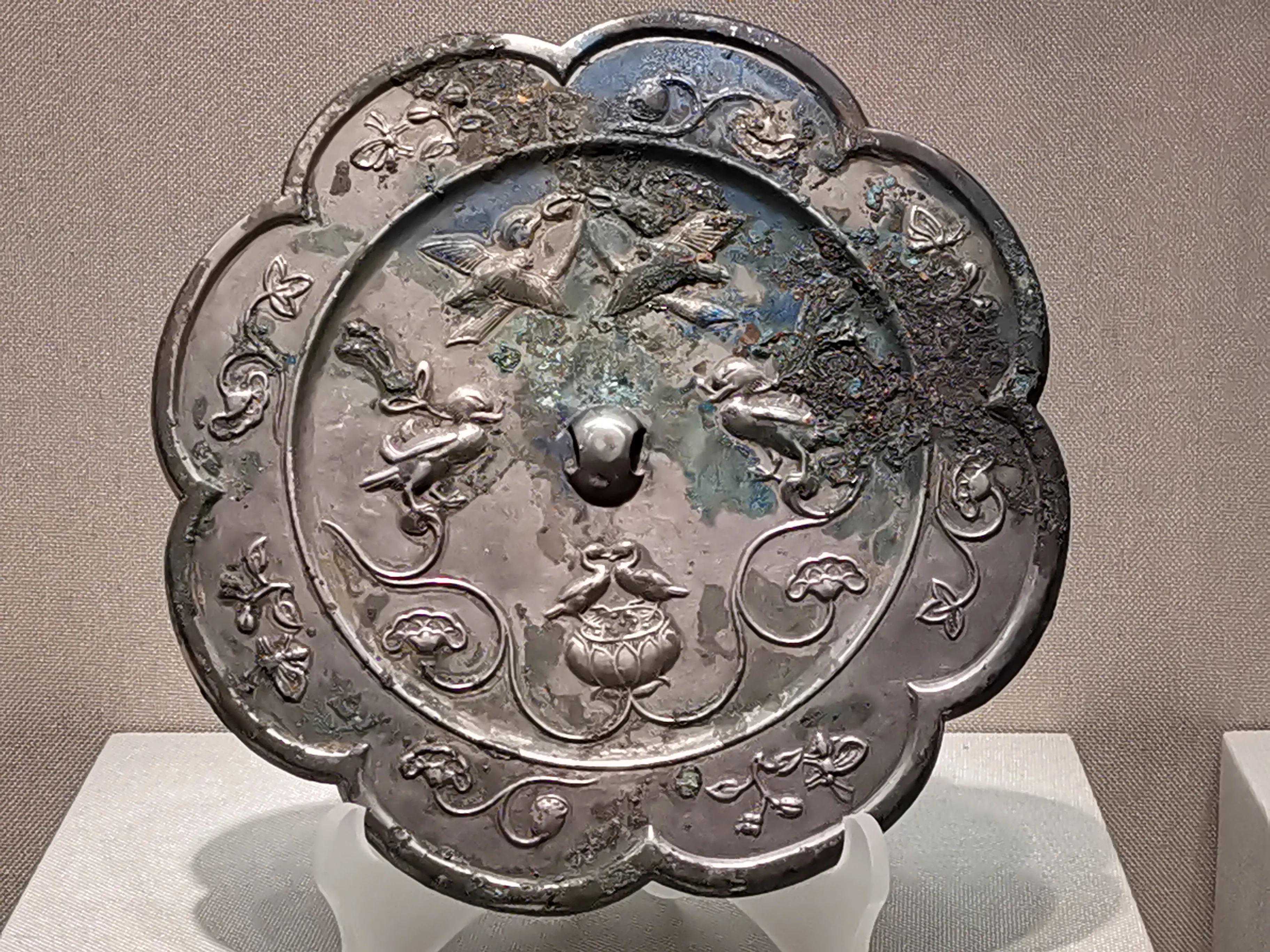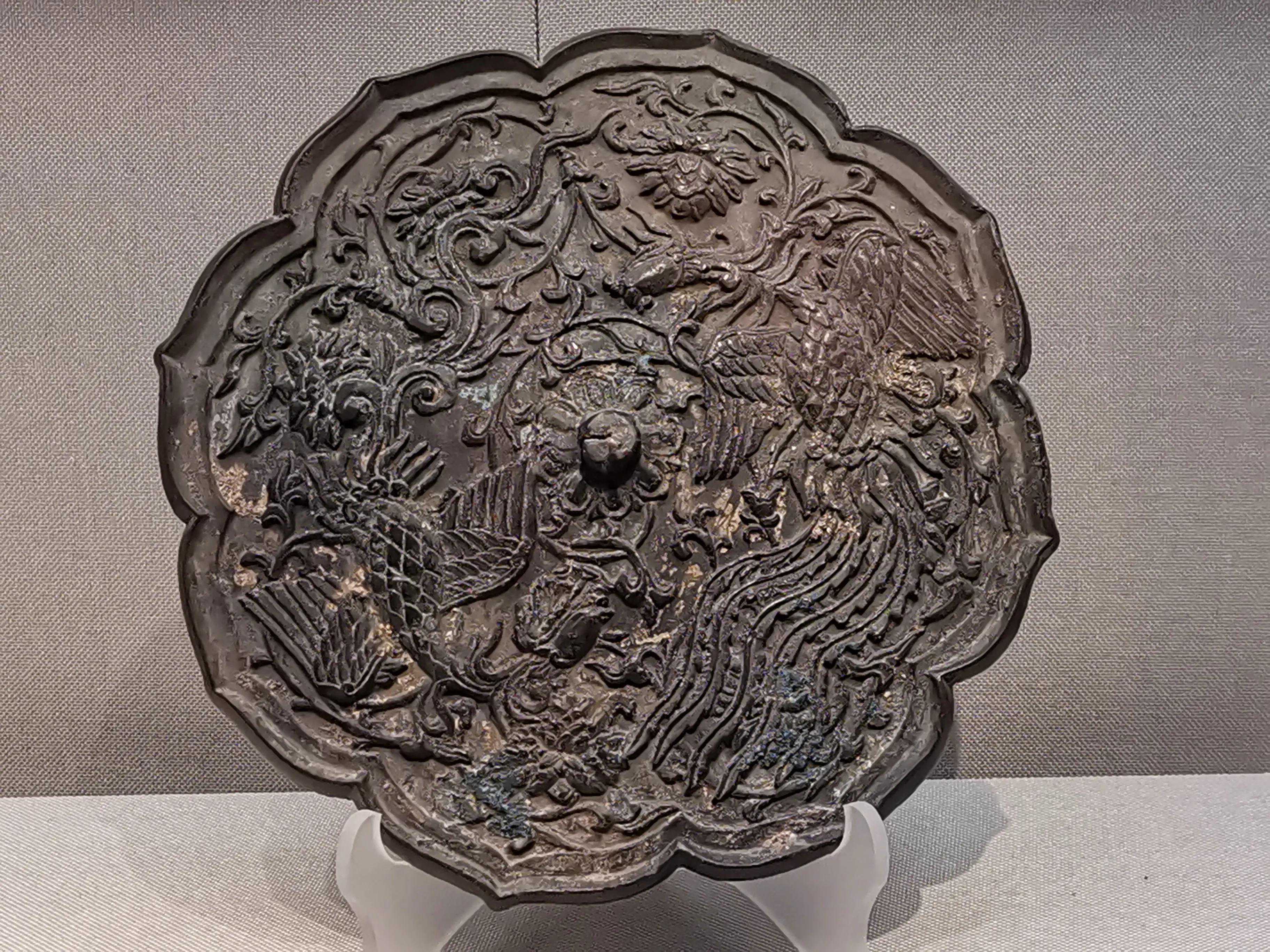 唐代铜镜不仅突破了之前以圆为主的形式,出现了菱花、葵花、方形、亚形镜,而且纹饰也突破了汉镜的刻板及图案化,布局灵活多样,题材丰富多彩,且有异域人文色彩。花鸟菱花镜、瑞兽葡萄镜、人物故事镜等,都反映着盛唐的气派,突出一种繁荣的氛围,充满了盛唐欣欣向荣的生活气息。工艺方面还出现了金银平脱镜、螺钿镜、贴金贴银镜等,成为后世铜镜铸造所无法超越的又一个高峰。其中瑞兽葡萄纹镜又称海马葡萄镜、海兽葡萄镜、狻猊葡萄镜。流行于盛唐,多采用瑞兽、花鸟、葡萄等图案做装饰。葡萄是汉武帝时张骞出使西域带回中国,其图案已经出现在汉代丝织品上,唐代将其与瑞兽纹巧妙地结合在铜镜装饰上,突破了汉镜规矩的格局,呈现出包容万象、海纳百川的盛唐气象。唐代铜镜另一流行纹饰是双鸾镜,也称对凤镜,主题纹饰是双凤对舞,口衔绶带。绶是古代系官印的丝带,代表官秩禄位,配以吉祥的莲荷图案和具有瑞象的凤,应是世人求取功名的美好愿望。