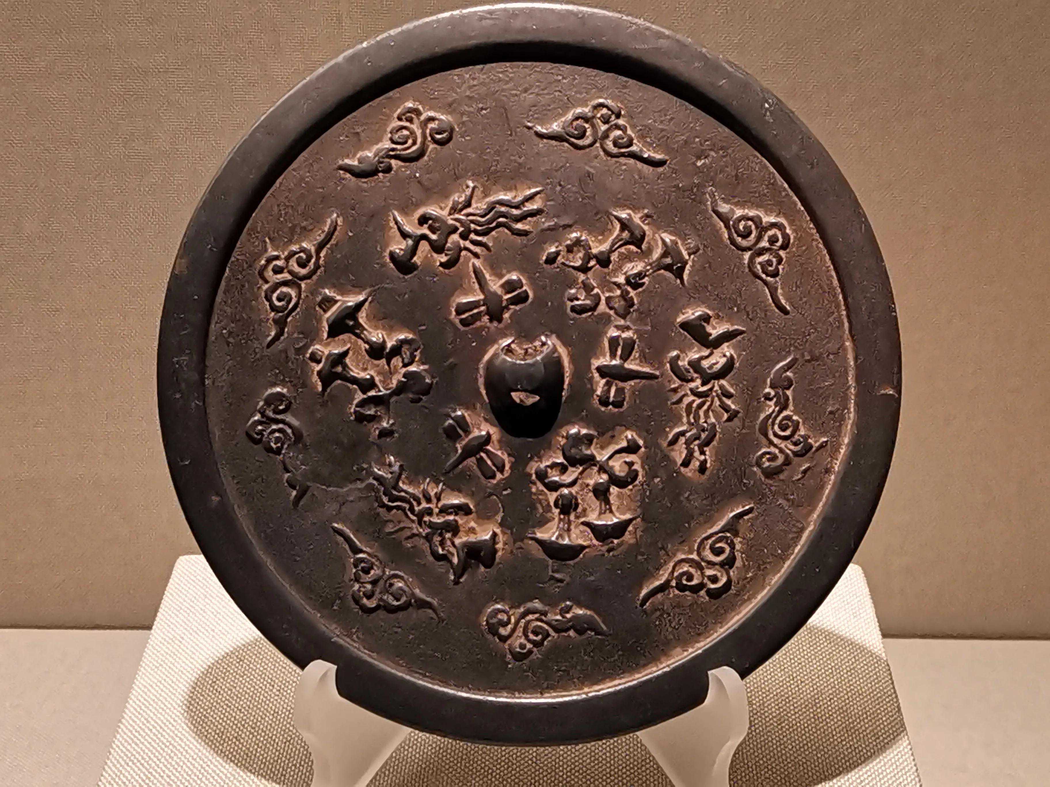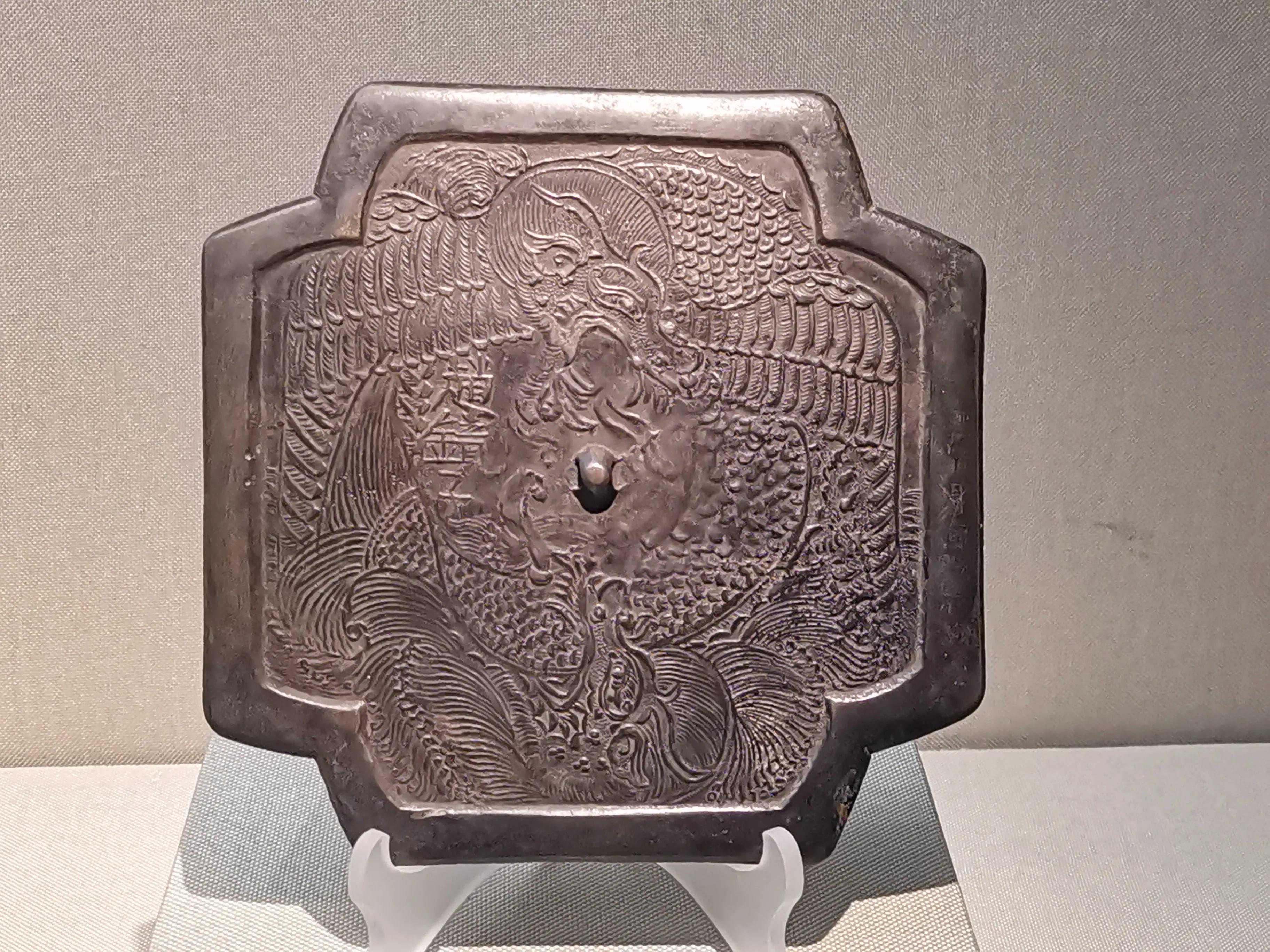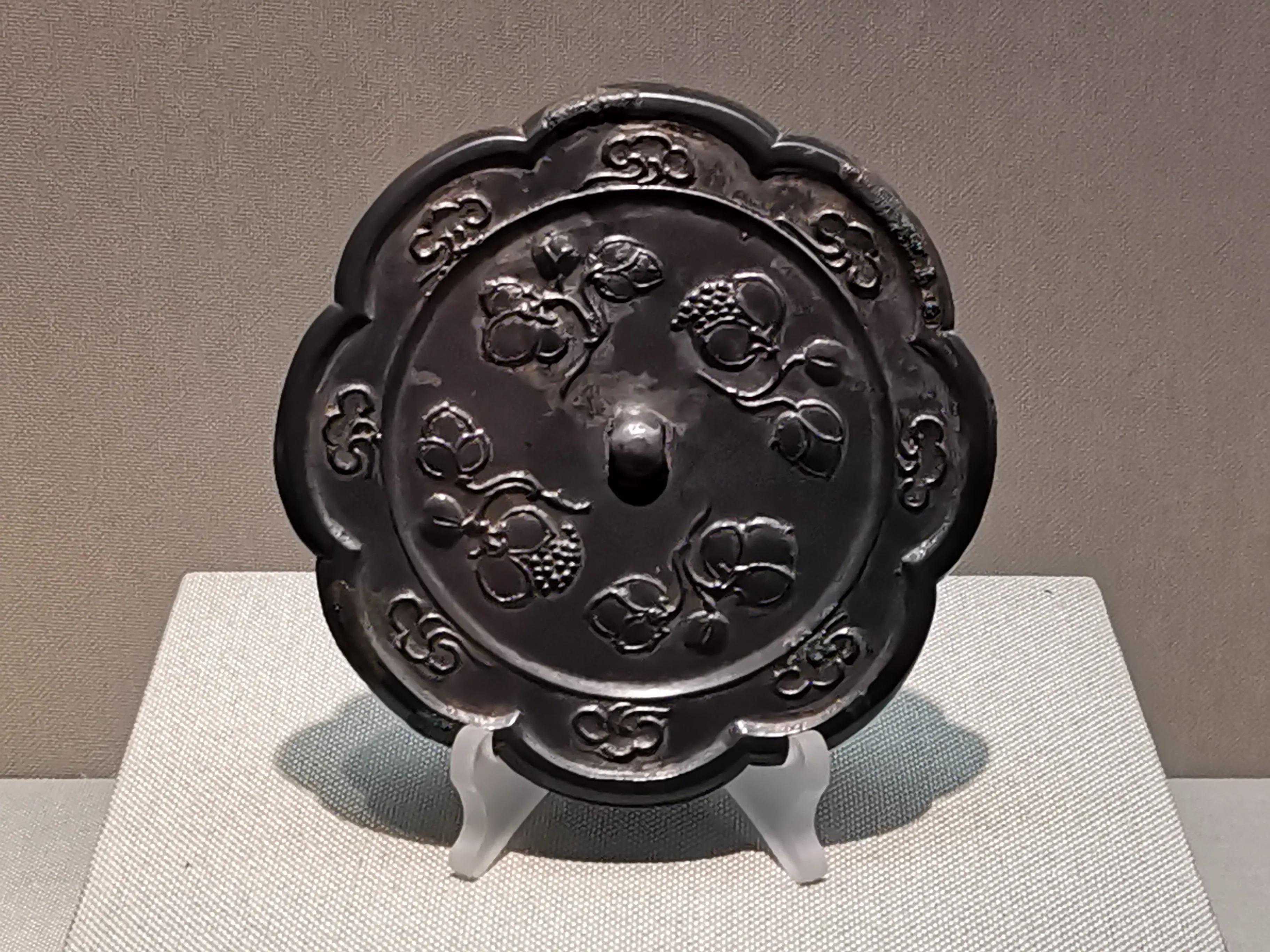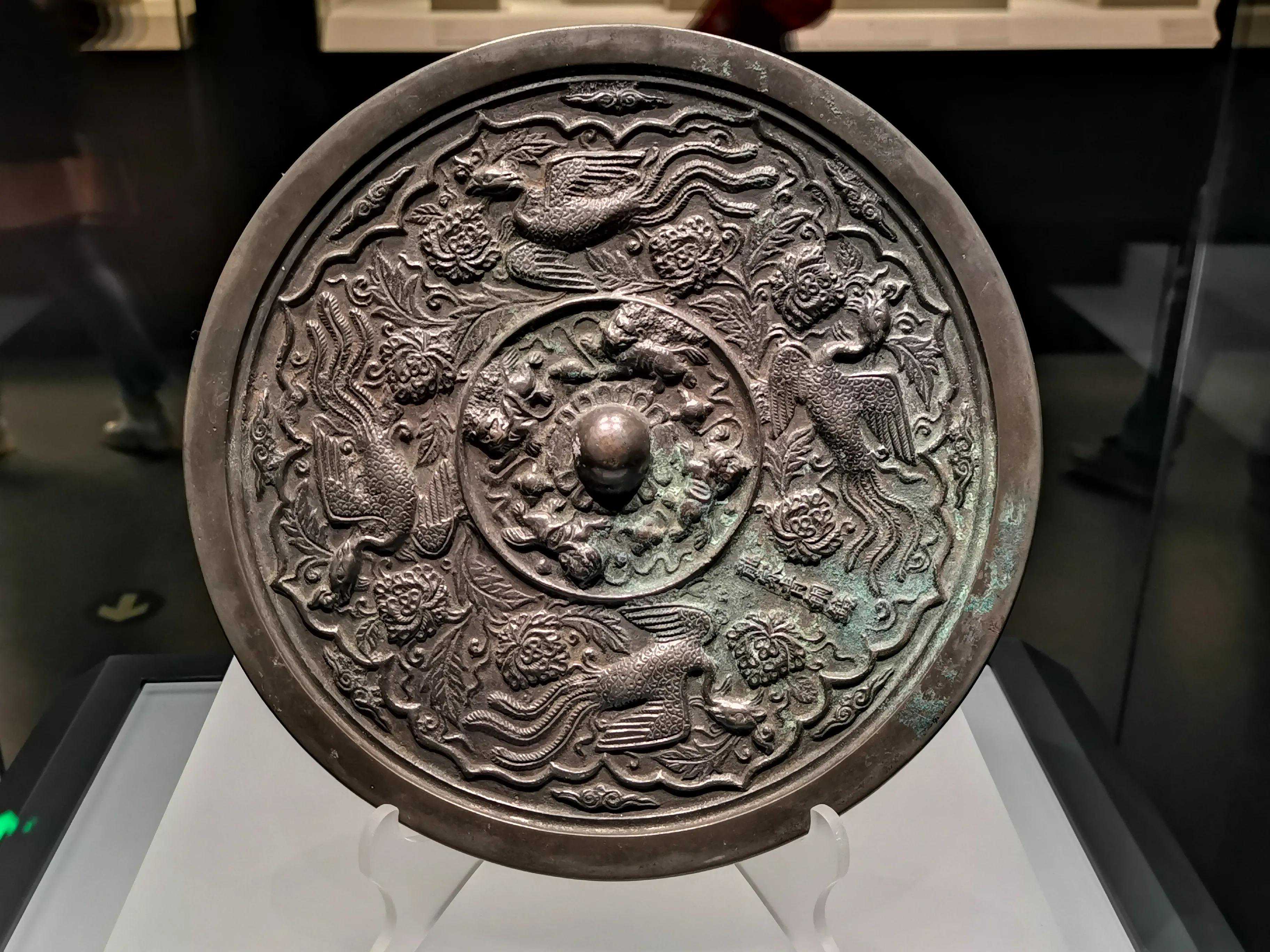 唐代铜镜不仅突破了之前以圆为主的形式,出现了菱花、葵花、方形、亚形镜,而且纹饰也突破了汉镜的刻板及图案化,布局灵活多样,题材丰富多彩,且有异域人文色彩。花鸟菱花镜、瑞兽葡萄镜、人物故事镜等,都反映着盛唐的气派,突出一种繁荣的氛围,充满了盛唐欣欣向荣的生活气息。工艺方面还出现了金银平脱镜、螺钿镜、贴金贴银镜等,成为后世铜镜铸造所无法超越的又一个高峰。其中瑞兽葡萄纹镜又称海马葡萄镜、海兽葡萄镜、狻猊葡萄镜。流行于盛唐,多采用瑞兽、花鸟、葡萄等图案做装饰。葡萄是汉武帝时张骞出使西域带回中国,其图案已经出现在汉代丝织品上,唐代将其与瑞兽纹巧妙地结合在铜镜装饰上,突破了汉镜规矩的格局,呈现出包容万象、海纳百川的盛唐气象。唐代铜镜另一流行纹饰是双鸾镜,也称对凤镜,主题纹饰是双凤对舞,口衔绶带。绶是古代系官印的丝带,代表官秩禄位,配以吉祥的莲荷图案和具有瑞象的凤,应是世人求取功名的美好愿望。