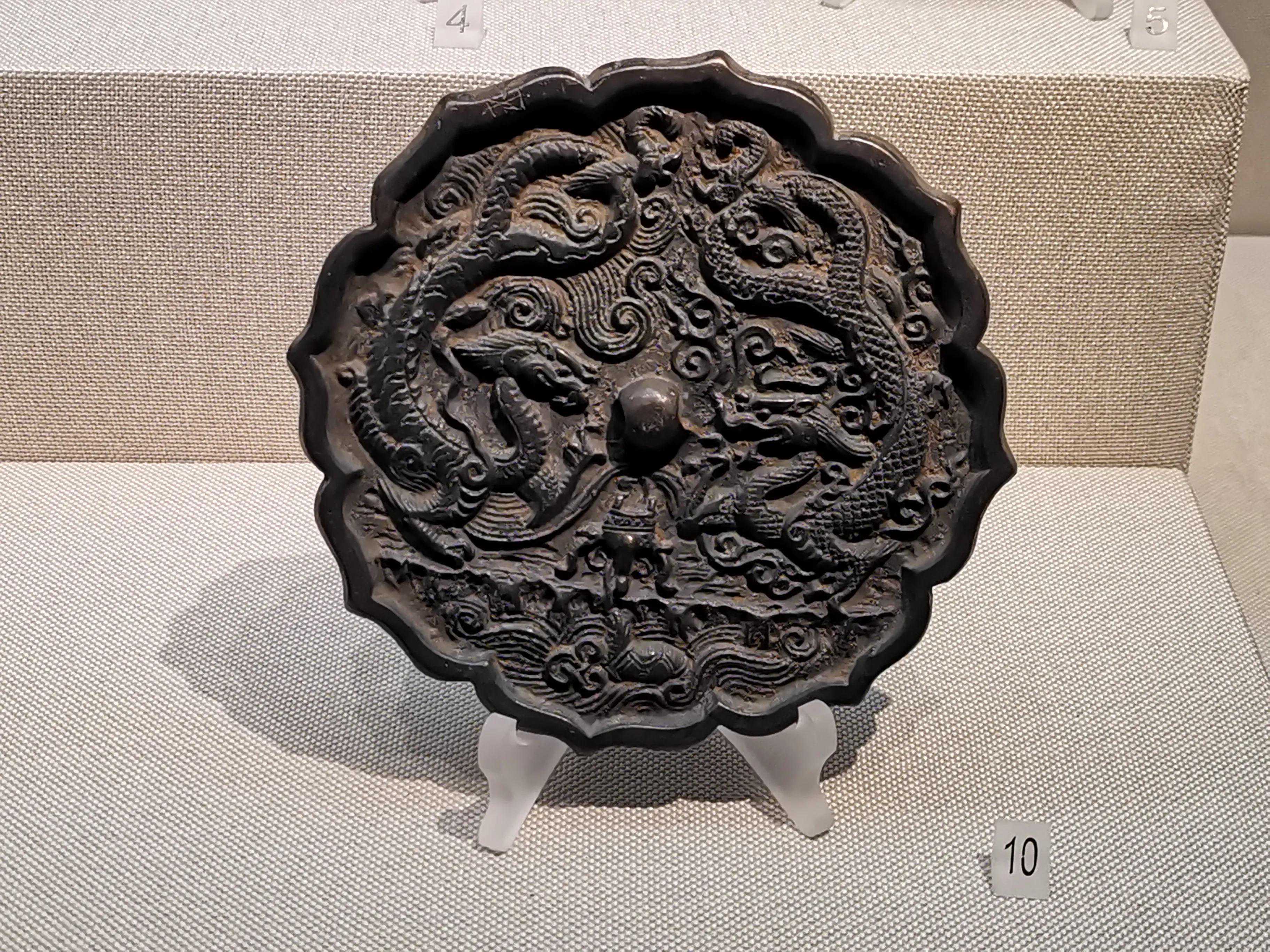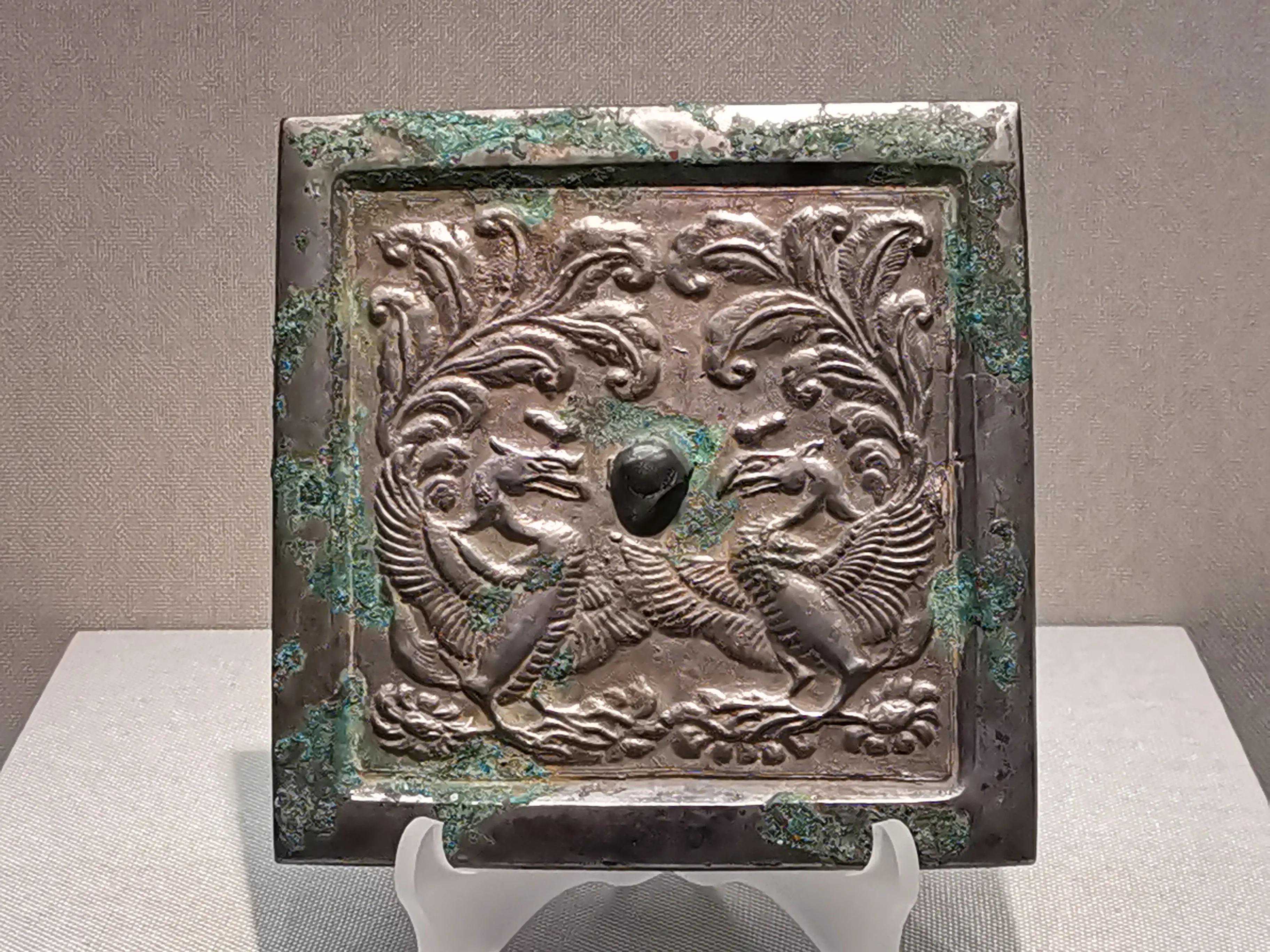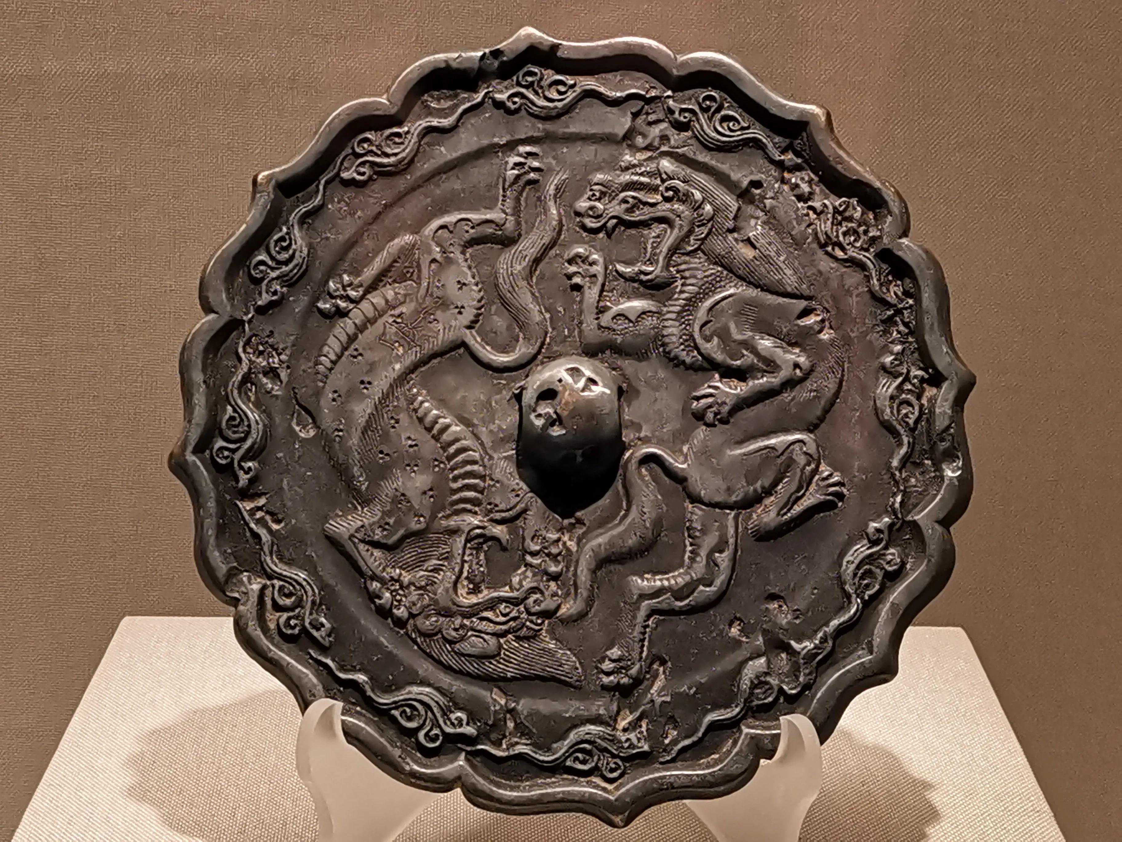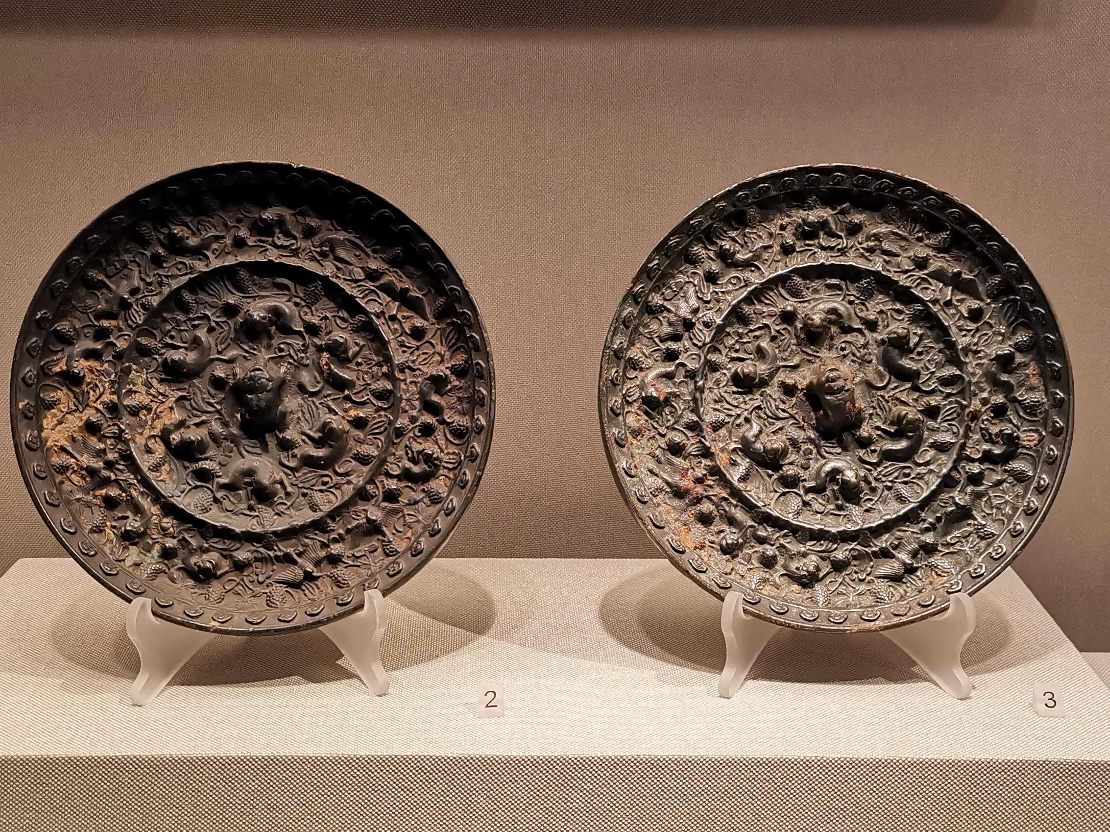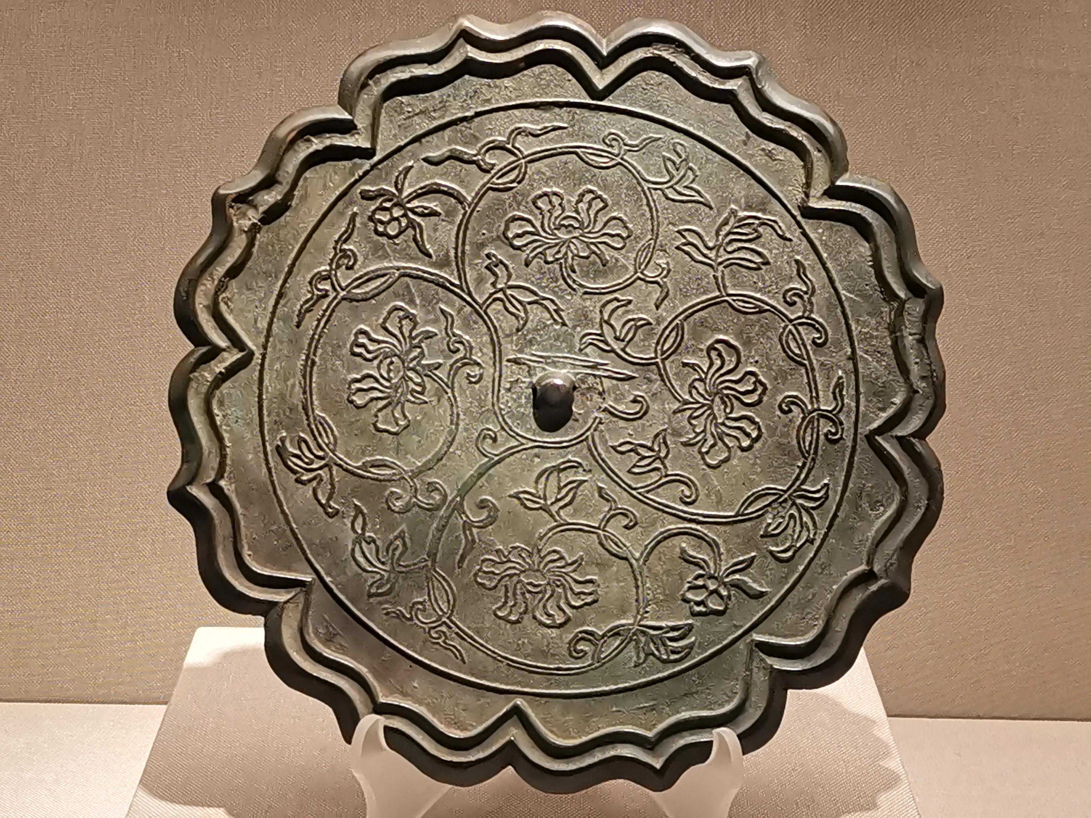 唐代铜镜不仅突破了之前以圆为主的形式,出现了菱花、葵花、方形、亚形镜,而且纹饰也突破了汉镜的刻板及图案化,布局灵活多样,题材丰富多彩,且有异域人文色彩。花鸟菱花镜、瑞兽葡萄镜、人物故事镜等,都反映着盛唐的气派,突出一种繁荣的氛围,充满了盛唐欣欣向荣的生活气息。工艺方面还出现了金银平脱镜、螺钿镜、贴金贴银镜等,成为后世铜镜铸造所无法超越的又一个高峰。其中瑞兽葡萄纹镜又称海马葡萄镜、海兽葡萄镜、狻猊葡萄镜。流行于盛唐,多采用瑞兽、花鸟、葡萄等图案做装饰。葡萄是汉武帝时张骞出使西域带回中国,其图案已经出现在汉代丝织品上,唐代将其与瑞兽纹巧妙地结合在铜镜装饰上,突破了汉镜规矩的格局,呈现出包容万象、海纳百川的盛唐气象。唐代铜镜另一流行纹饰是双鸾镜,也称对凤镜,主题纹饰是双凤对舞,口衔绶带。绶是古代系官印的丝带,代表官秩禄位,配以吉祥的莲荷图案和具有瑞象的凤,应是世人求取功名的美好愿望。