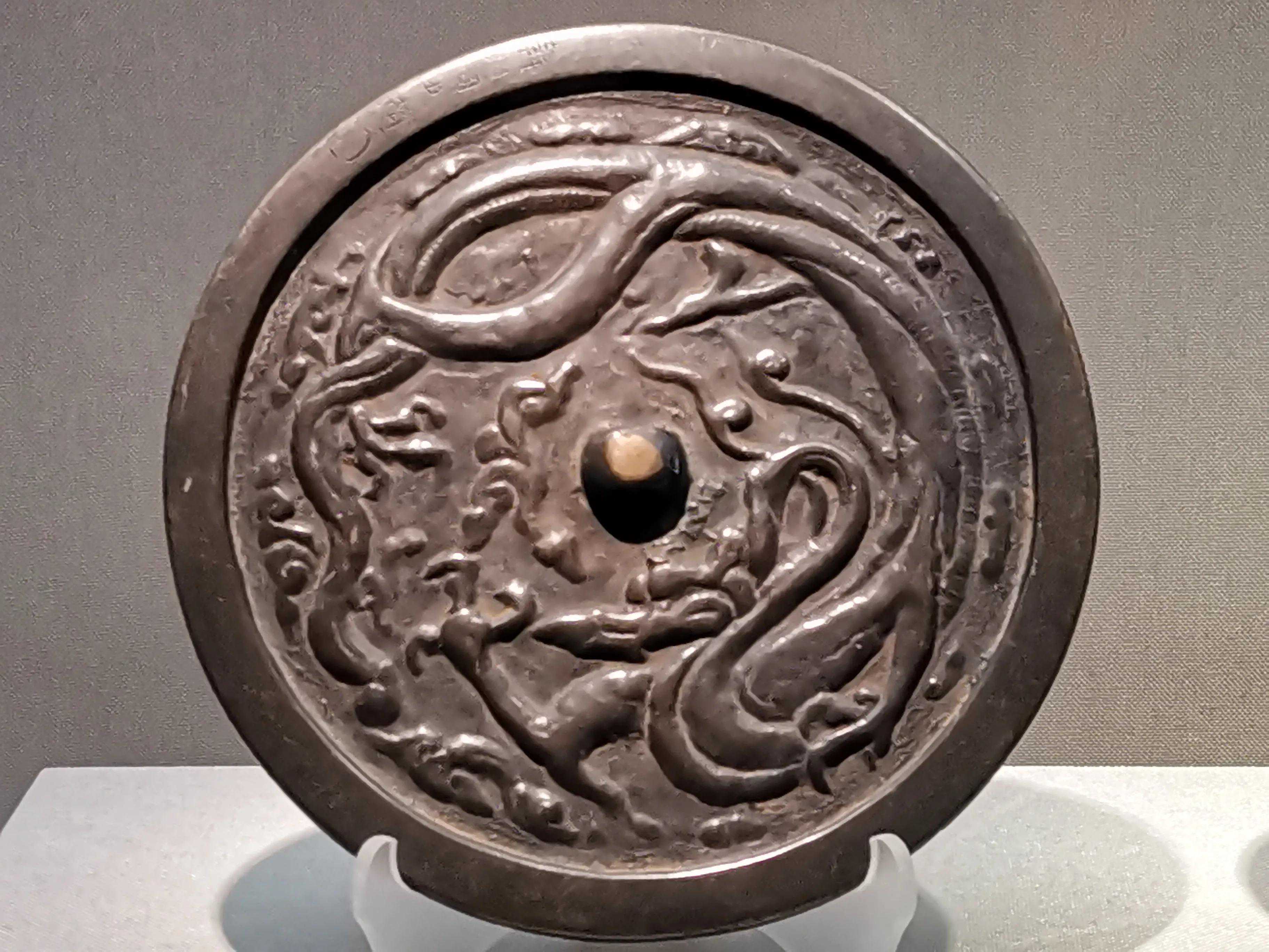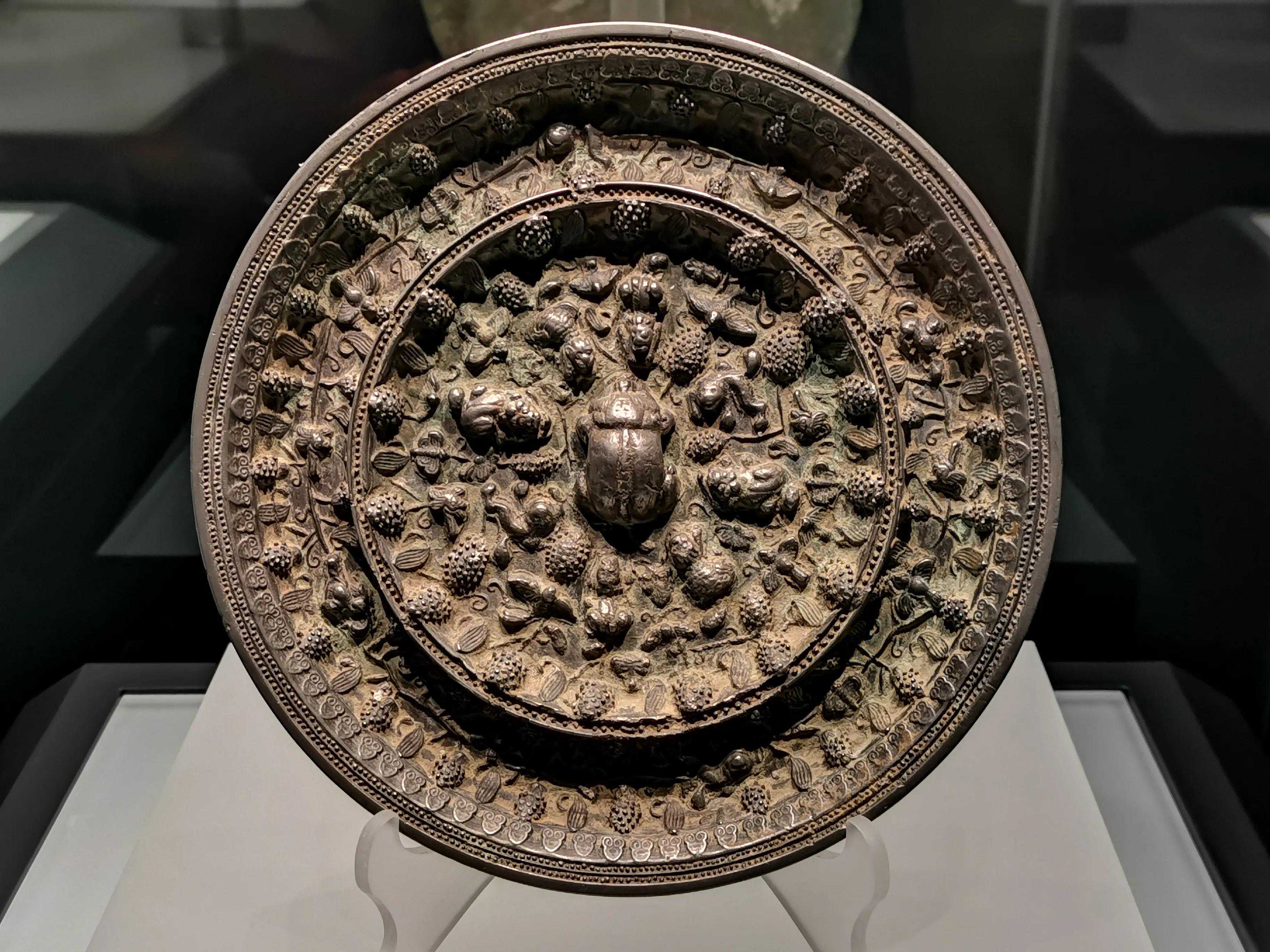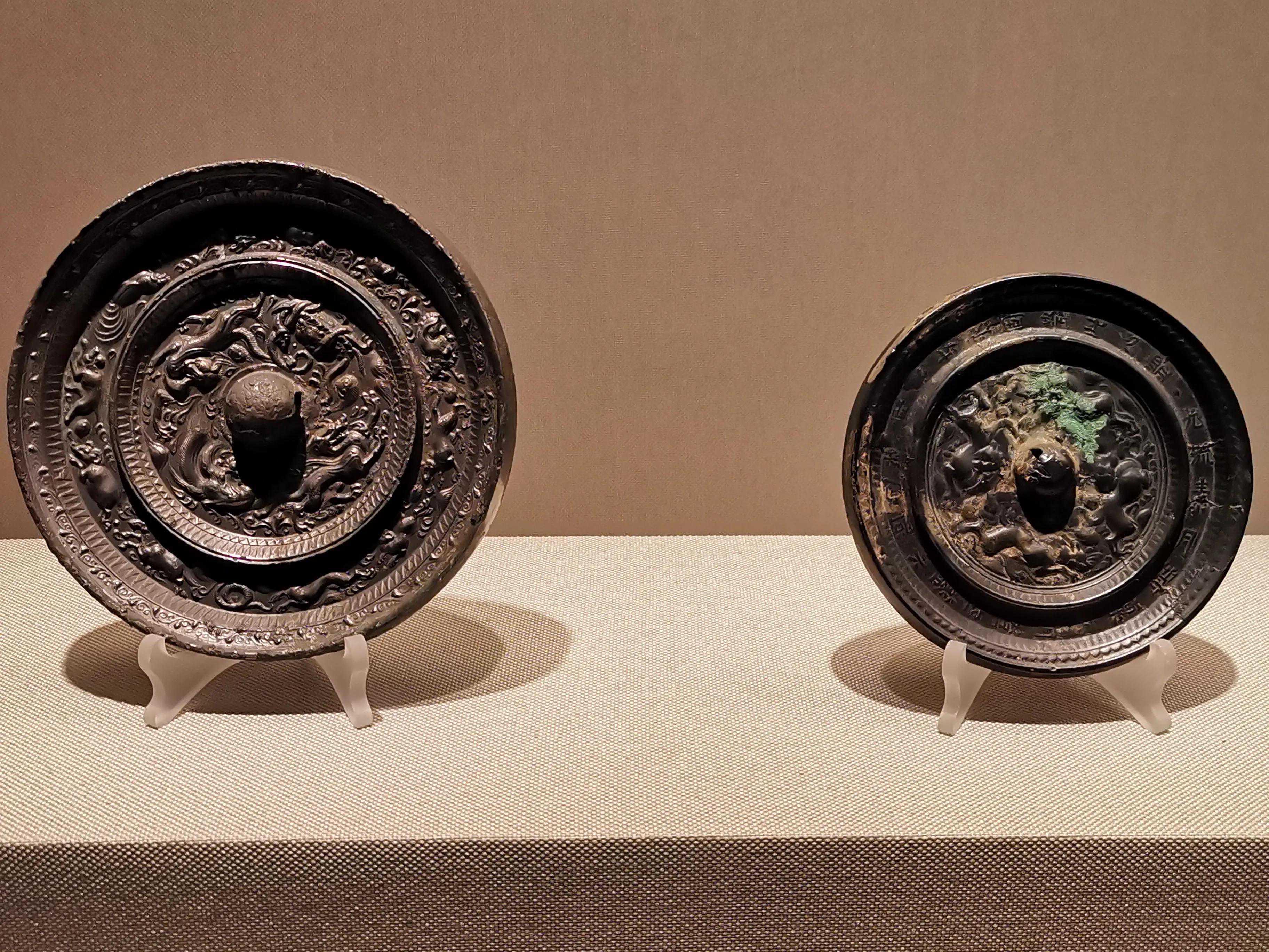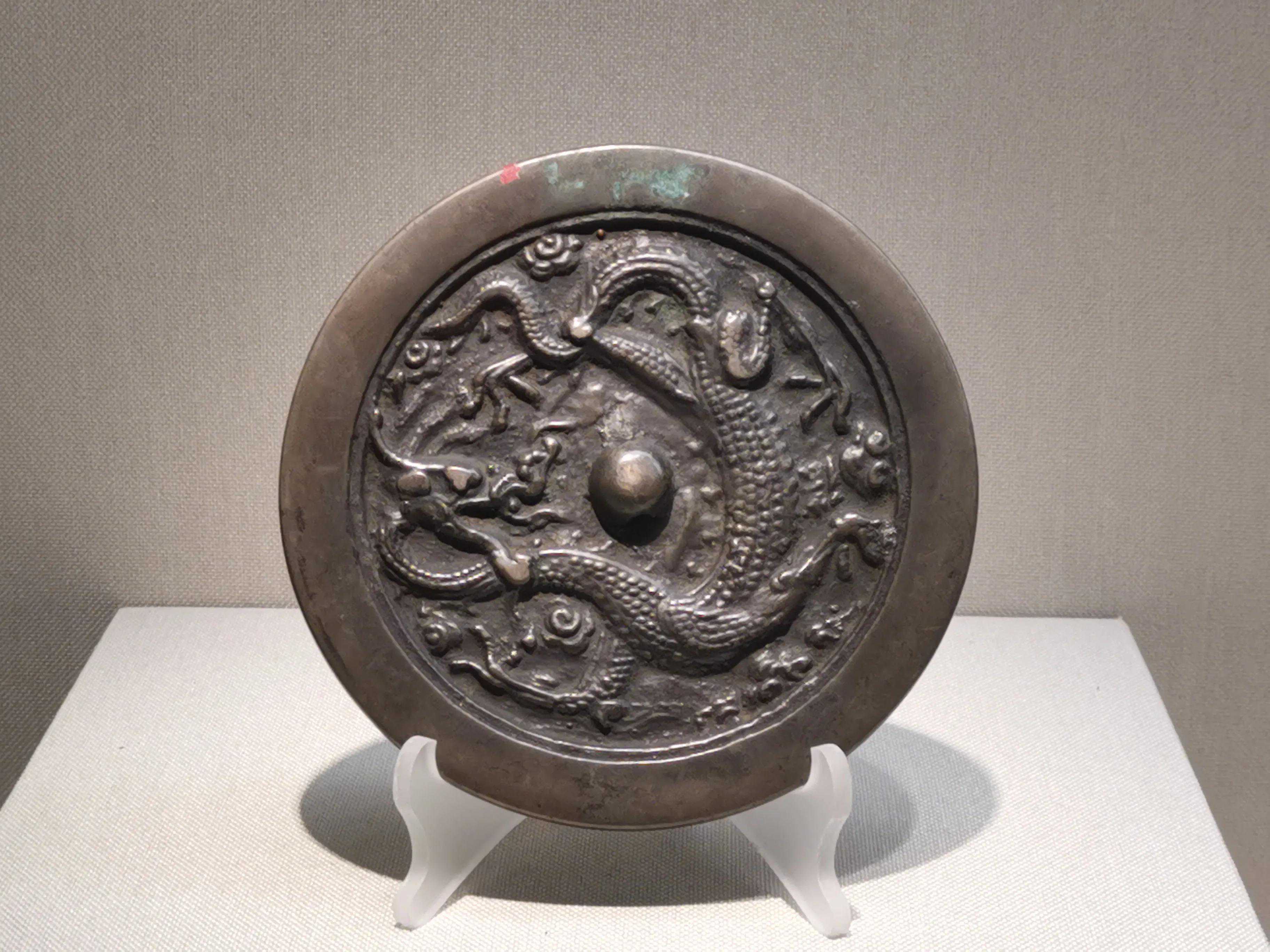唐代铜镜不仅突破了之前以圆为主的形式,出现了菱花、葵花、方形、亚形镜,而且纹饰也突破了汉镜的刻板及图案化,布局灵活多样,题材丰富多彩,且有异域人文色彩。花鸟菱花镜、瑞兽葡萄镜、人物故事镜等,都反映着盛唐的气派,突出一种繁荣的氛围,充满了盛唐欣欣向荣的生活气息。工艺方面还出现了金银平脱镜、螺钿镜、贴金贴银镜等,成为后世铜镜铸造所无法超越的又一个高峰。其中瑞兽葡萄纹镜又称海马葡萄镜、海兽葡萄镜、狻猊葡萄镜。流行于盛唐,多采用瑞兽、花鸟、葡萄等图案做装饰。葡萄是汉武帝时张骞出使西域带回中国,其图案已经出现在汉代丝织品上,唐代将其与瑞兽纹巧妙地结合在铜镜装饰上,突破了汉镜规矩的格局,呈现出包容万象、海纳百川的盛唐气象。唐代铜镜另一流行纹饰是双鸾镜,也称对凤镜,主题纹饰是双凤对舞,口衔绶带。绶是古代系官印的丝带,代表官秩禄位,配以吉祥的莲荷图案和具有瑞象的凤,应是世人求取功名的美好愿望。