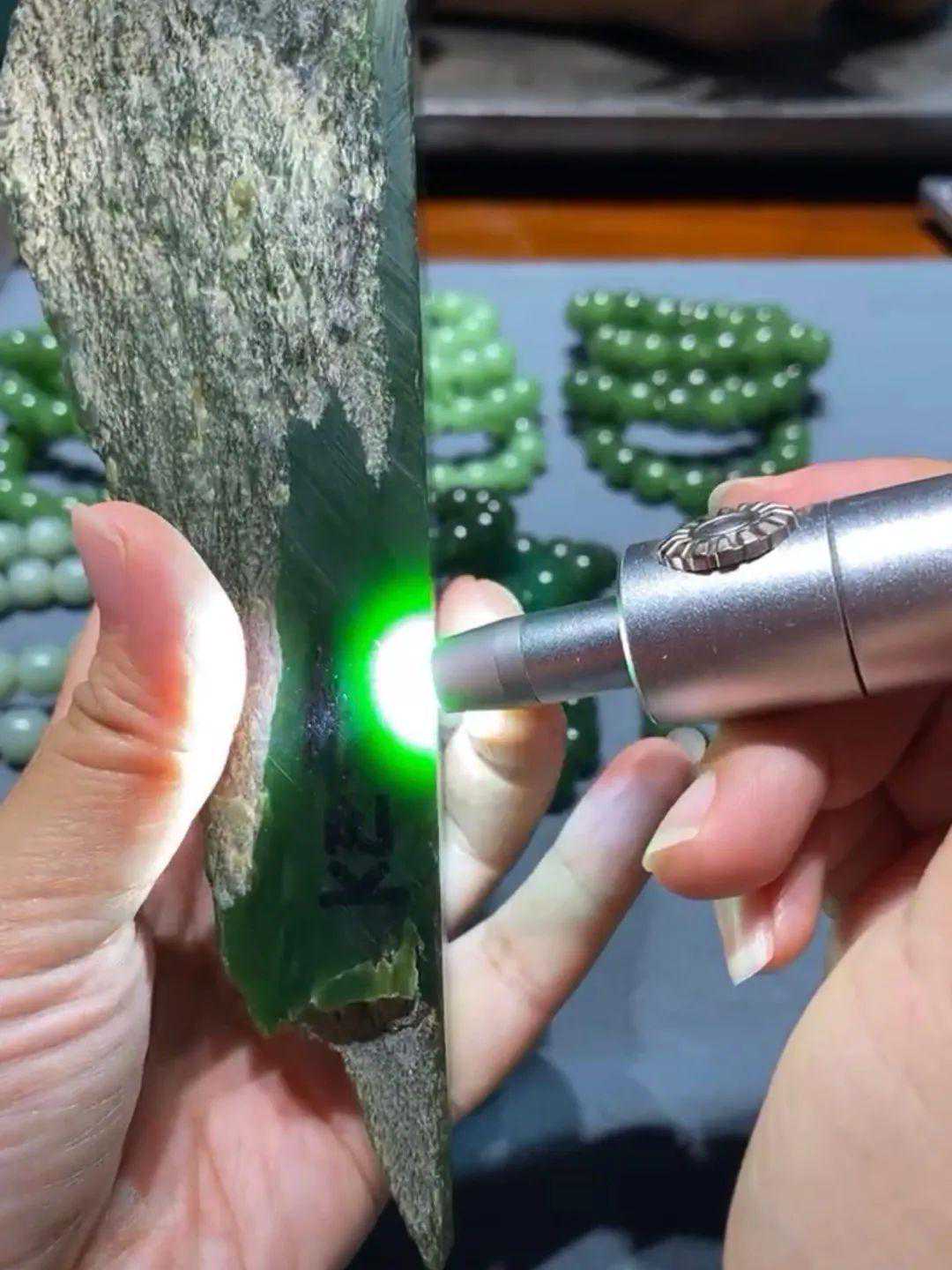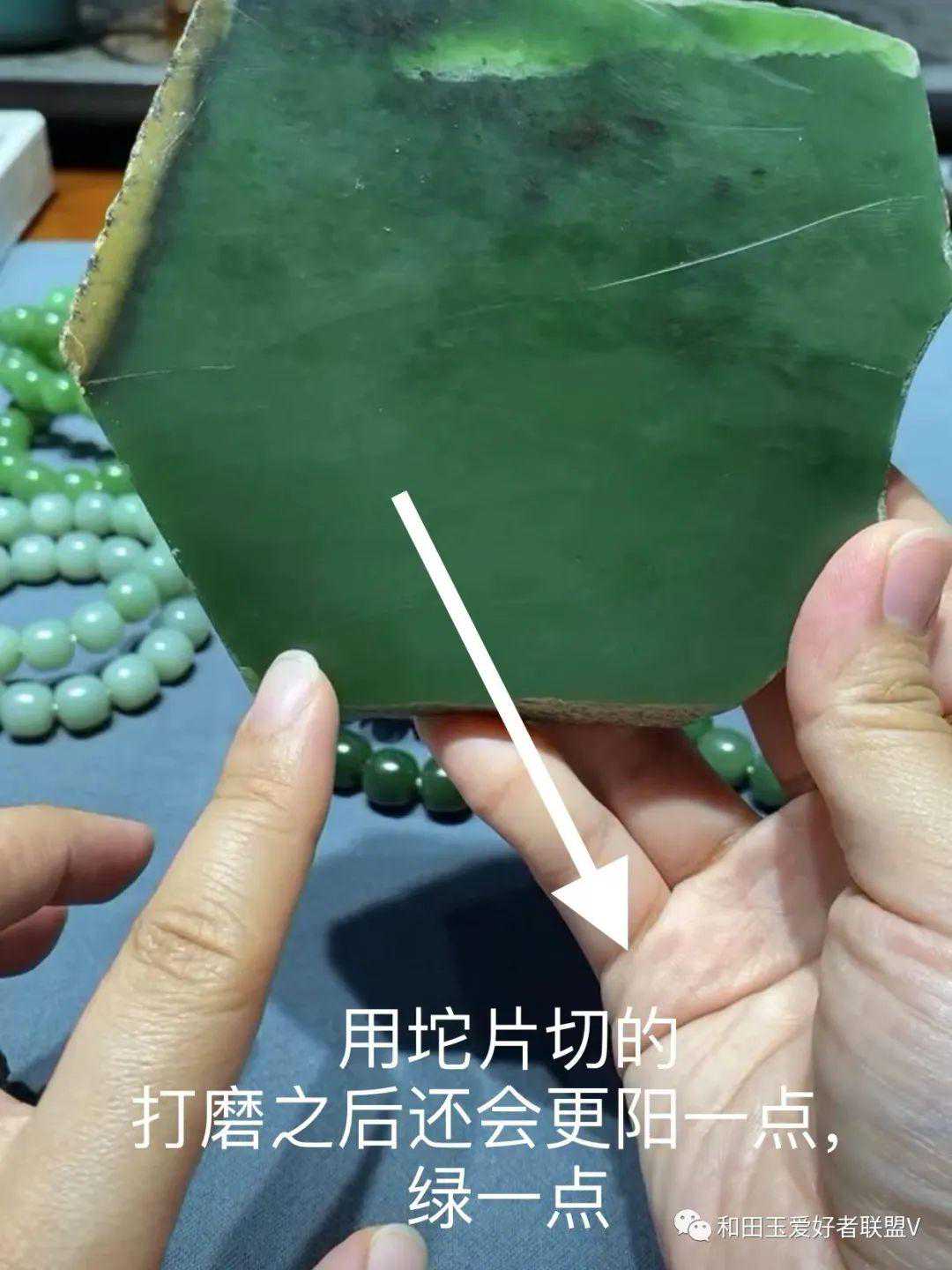 这个片儿是用砣片切的,那么它在最后做完成品打磨完了之后,颜色一定会比现在这个状态还要再阳一点,再绿一点。