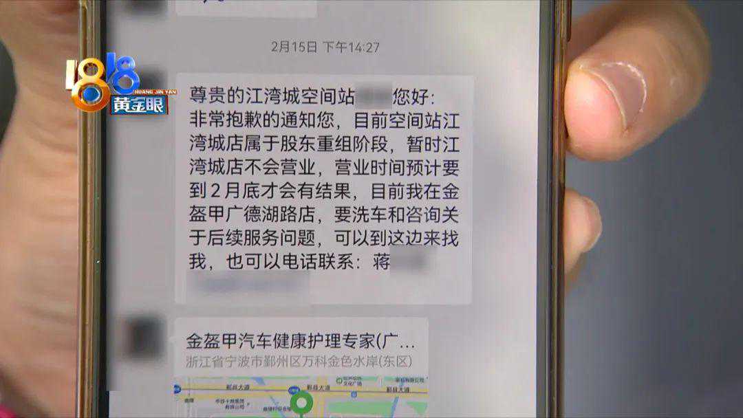 李女士说,转账之后并没有拿到会员卡,当时蒋店长解释,她的手机以后会收到会员卡的消费信息。直到今年过完春节假期,她才去“A+空间站”江湾城店洗车,结果发现店门关着。2月15号,蒋店长给李女士发来微信说,“目前空间站江湾城店属于股东重组阶段,暂时江湾城店不会营业,营业时间预计要到2月底才会有结果”。蒋店长还表示,他在鄞州区广德湖路的“金盔甲”洗车店工作,李女士可以来这家店消费。
