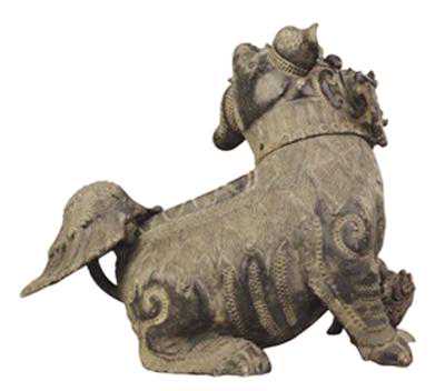 这件太狮少狮瓷塑(图①),通高31、通长37、通宽20.5厘米,整体造型雕塑一大一小两只狮子。大狮即太狮,头大,腹圆,翘尾。面部刻画细致、生动,两只圆圆的大眼睛凸出,浓浓的眉毛纹理清晰,两只大耳朵半卷半张开,头顶雕刻出几卷盘旋的法毛,狮鼻硕大,狮嘴张开露出两排整齐的牙齿。整个面部的表情既显出威猛,更伴有可爱。在狮子的颈部雕刻有一周纹饰,颈部两侧各有一个四瓣花纹,花瓣中间刻有一个“卍”纹(万字纹),由颈部向下飘有两条绶带。狮子的腹部和背部(图②)也都刻有细密的纹饰,尾部蓬松展开并刻划纹理,如莲花与莲蓬。太狮四足健硕,两只后足与右前足着地,左前足抚踏着一只小狮子。小狮即少狮,造型与纹理均与太狮相似。值得一提的是,整件器物由大狮子的头部、身子、尾部及小狮子四个可拆合的部分组成,套合巧妙,通体为古铜色,有仿铜器狮子的风格。