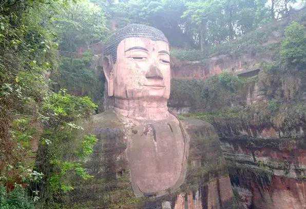 弥勒佛坐像,石料,通高71米,公元803年建成,依凌云山栖霞峰临江峭壁凿造而成,又名凌云大佛,开凿于唐玄宗开元初年(公元713年),历时90年大佛终告完成。佛像高71米,佛头长14.7米,头宽10米,肩宽24米,耳长7米,耳内可并立二人,脚背宽8.5米,可坐百余人,素有“佛是一座山,山是一尊佛”之称。