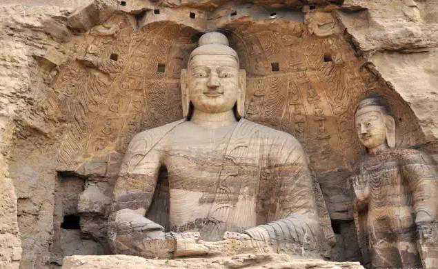 释迦牟尼坐像,石料,高达17米,是云冈石窟中最大的佛像。佛像形态端庄,是中原文化传统的表现手法;但其脸部形象:额宽、鼻高、眼大而唇薄,却具有外域佛教文化的某些特征。云冈石窟开凿于北魏和平年间,距今已有1500多年的历史。历时约30年才基本完成这一浩大的艺术工程。