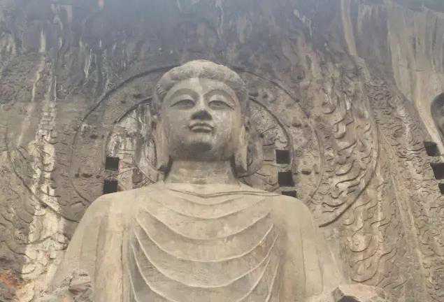 卢舍那佛,石料,属世界文化遗产。通高17.14米,头高4米,耳长1.9米,是按照武则天的形象塑造的,作于唐高宗咸亨四年,即公元672年,是龙门石窟中艺术水平最高、整体设计最严密、规模最大的一处。梵语“卢舍那佛”即光明普照、光辉普遍之意,是源自古代日神崇拜的太阳神信仰而来。