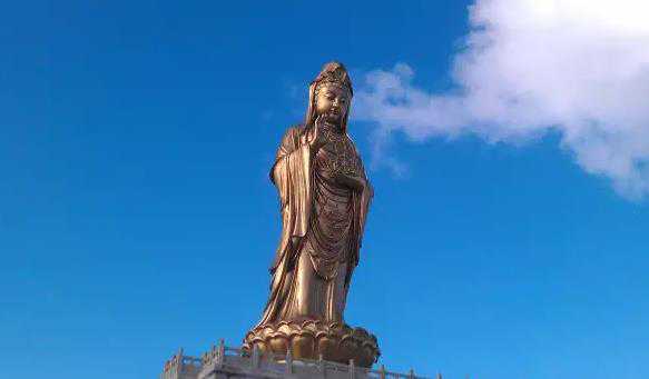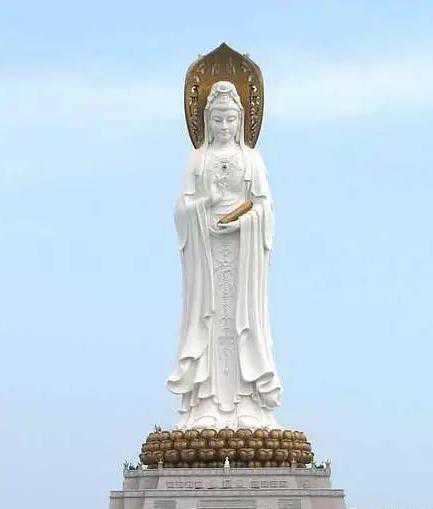 钢筋混凝土材料,高达108米,比美国的自由女神像还要高15米。2005年4月24日举行开光大典。像体为正观音的一体化三尊造型,宝相庄严,脚踏108瓣莲花宝座,宝座下为金刚台,金刚台内是面积达15000平方米的圆通宝殿。南海观音像通过高科技手法,组合运用声、光、电技术,进行大型灯光夜景演示,充分展示了“佛光普照”的效果。