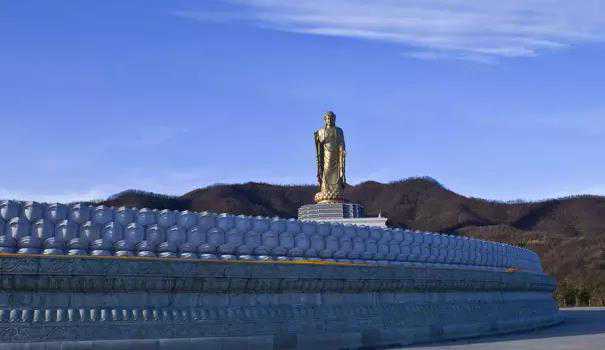 释迦牟尼坐像,锡青铜材料,2004年4月建成。高38.66米,重380吨,由232件佛体、108块莲花瓣、302个发髻、共642块锡青铜铸件组合而成,堪称目前世界第一铜铸大坐佛。南山大佛融古今中外佛像铸造艺术的精华,使古老的青铜铸造艺术和现代科技成果于一体,展现了佛教文化和现代文明的完美结合。