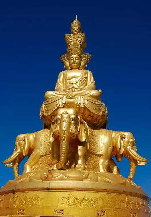 是世界上最高的金佛,也是第一个十方普贤的艺术造型。金佛系铜铸镏金工艺造像。金佛通高48米,代表的是阿弥陀佛48个愿望。“十方”,一是意喻普贤的十大行愿,二是象征佛教中的十个方位。如果说公元980年安坐于万年寺高7.85米的普贤铜像作为峨眉山千年的镇山之宝,为这座佛教名山增辉千年的话,那么,高达48米的十方普贤金像,更是登峰造极之作。