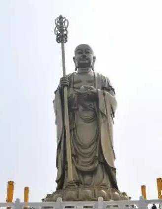 为比丘立相,右手执锡杖,左手托摩尼宝珠,仪态安详,妙相庄严。铜像气势恢弘,高达99米,与九华山99座山峰、金地藏享年99岁的寓意相一致。铜像采用铸造方式,选用仿金铜,2003年11月13日开工,到2009年3月铜像主体结构完工,2013年9月1日开光。