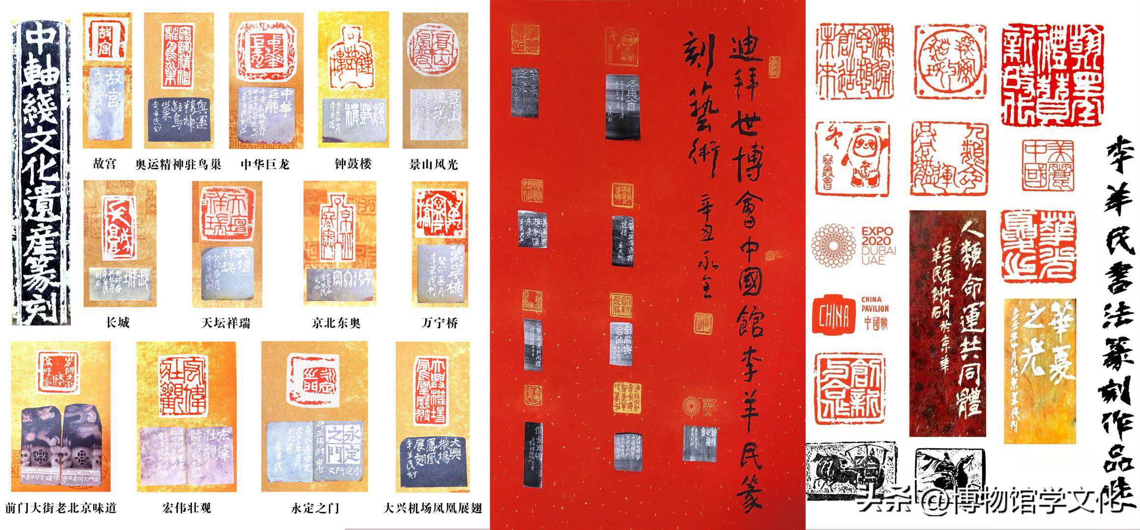 特别是2021年迪拜世博会期间,李羊民先生应组委会之邀篆刻的“华夏之光”“沟通世界创造未来”“人类命运共同体”“创新与合作”“美丽中国”“探索与发现”等10方印章成为中国馆的一大亮点。以组印制成的“中国印—李羊民篆刻艺术打卡迪拜世博会中国馆特制护照”,方便观众到各展厅打卡,免费参与篆刻互动体验,营造了游客近距离了解、参与、感知和热爱中国篆刻非遗的氛围。
