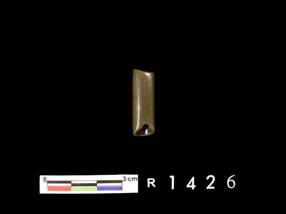 灰色长方形小石斧,两端均向内协中间有一原穿孔,表面经搓平,部份剥蚀失原来石皮,一面平齐,另一面则向刃部逐渐减少,刃部完整,偏锋。
