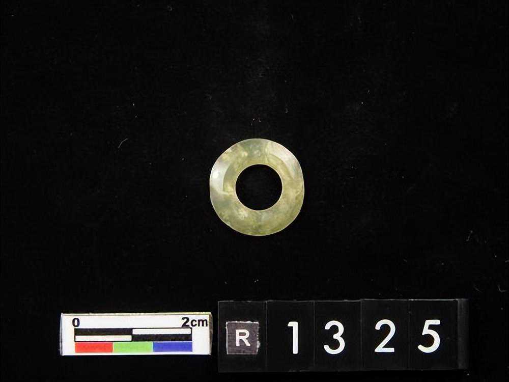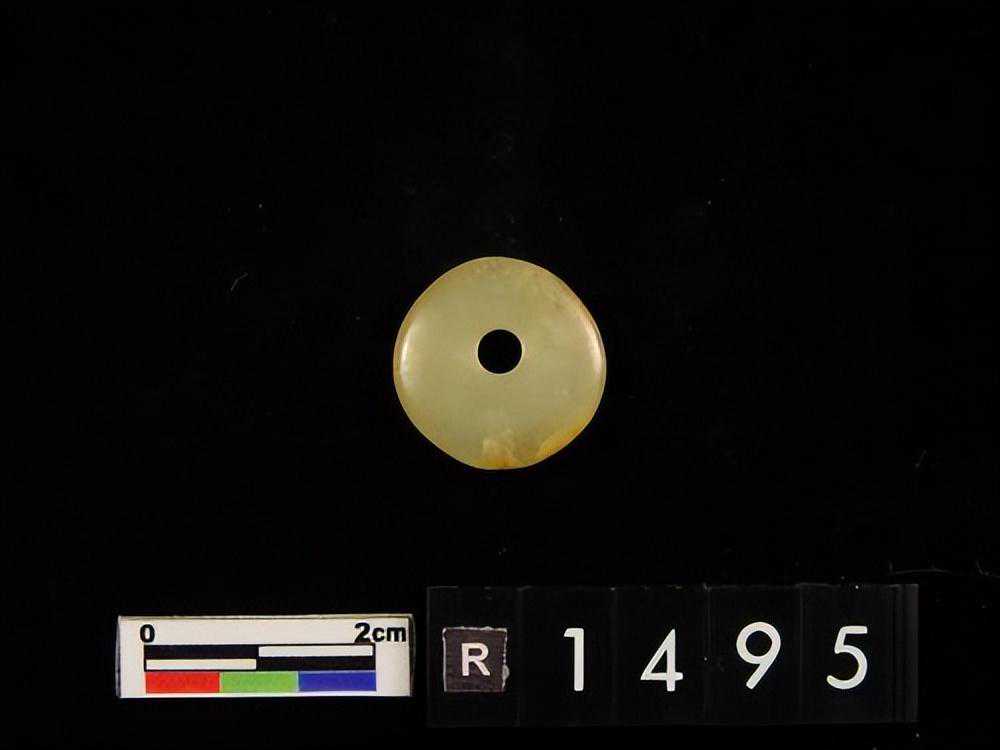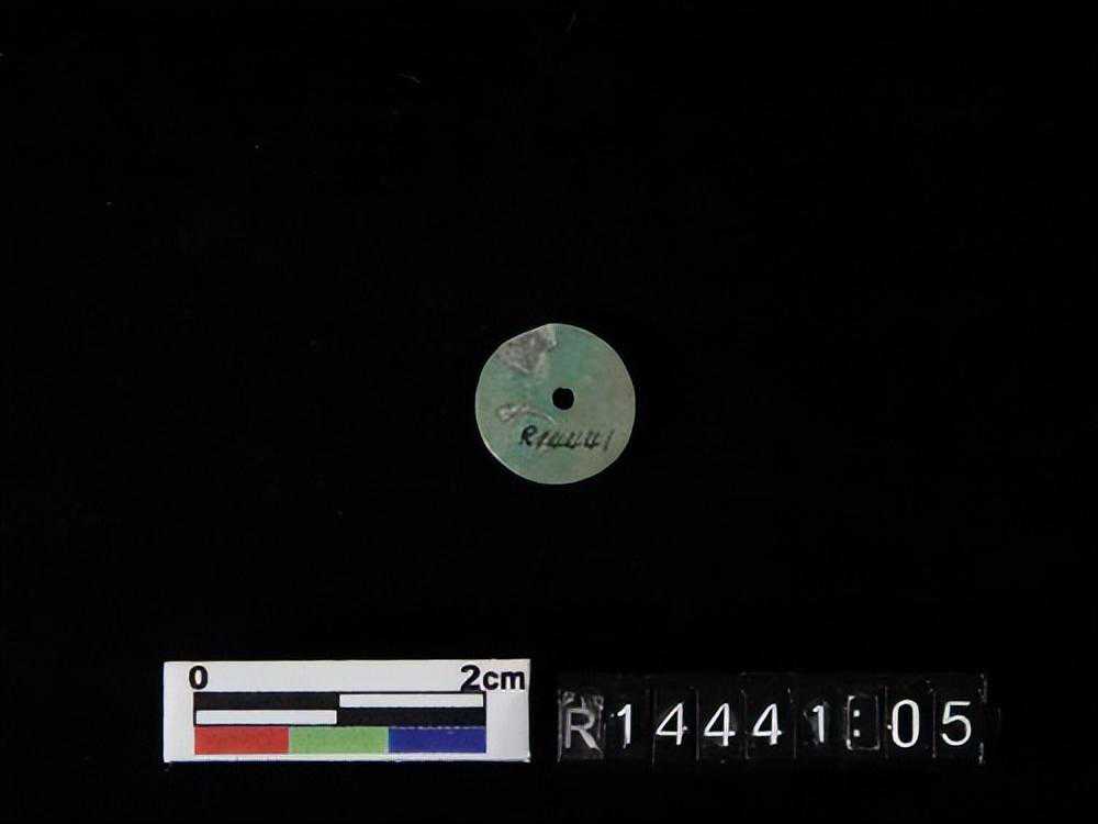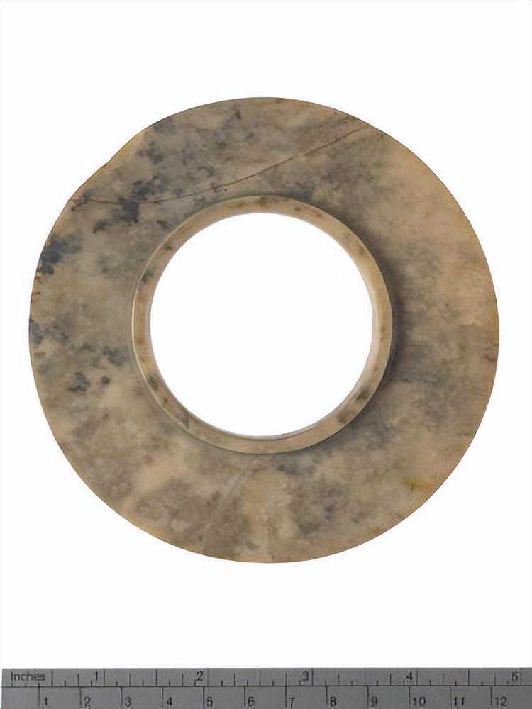 色灰白,杂绿斑,形式同1550-40墓里出的玉凸边璧(R00912)。