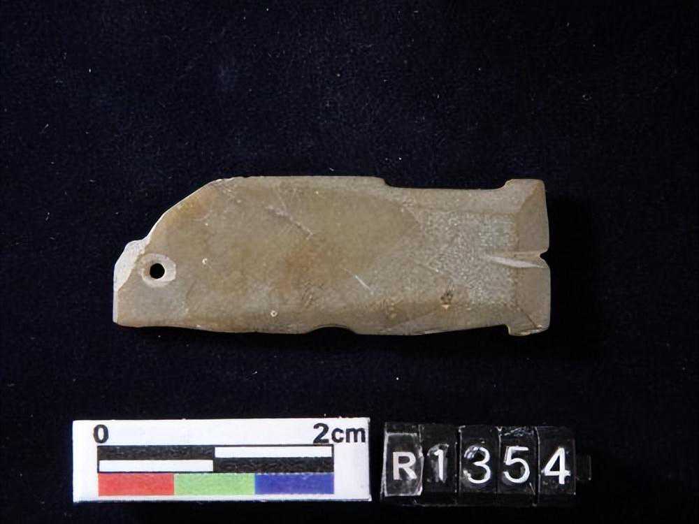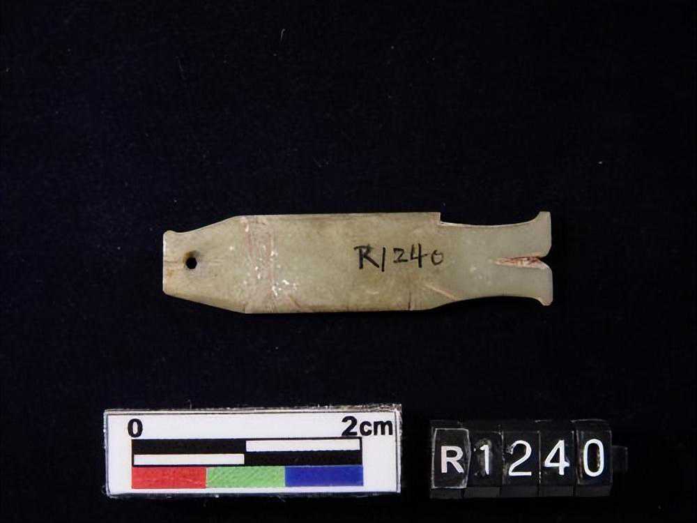 1443墓。。。玉鱼璜,目為一小孔,背腹鰭均為細小之刻文,尾薄如刀刃。。。