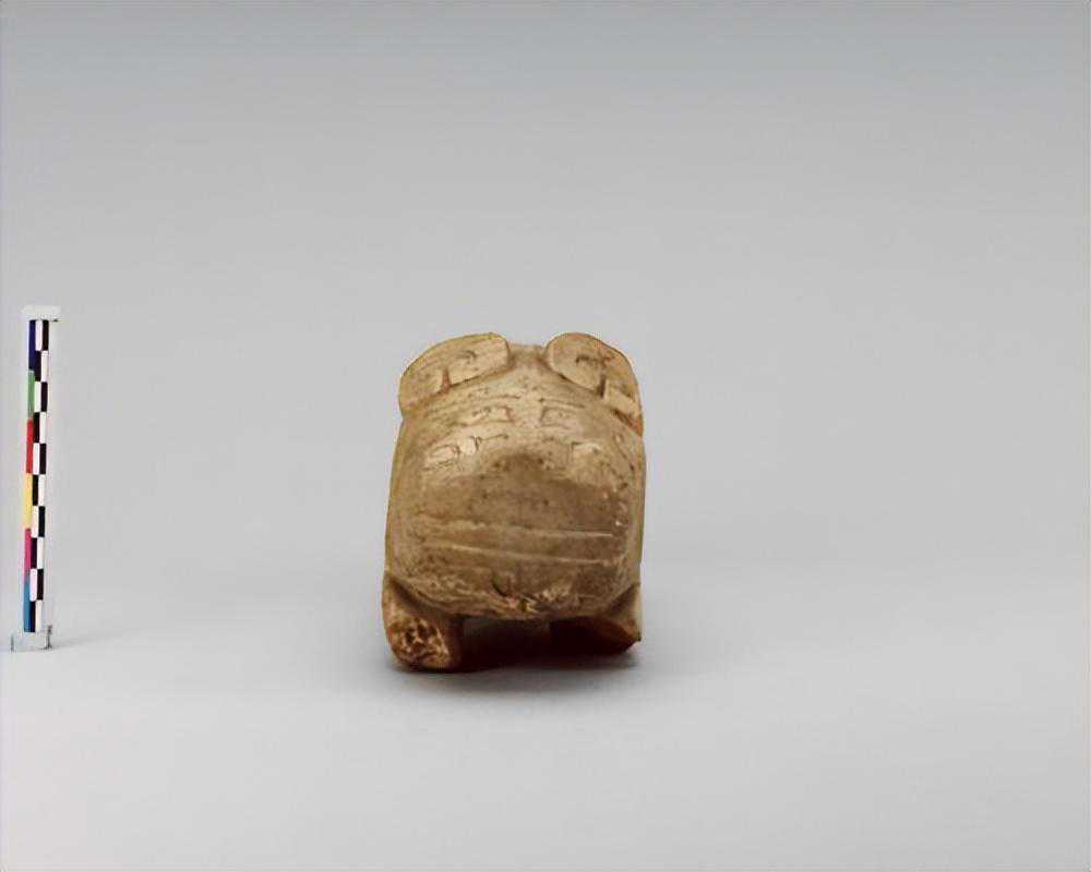 全体作近圆形,头突出,四足屈曲作俯伏,正面及四肢俱凸起,中有一孔,色绿。