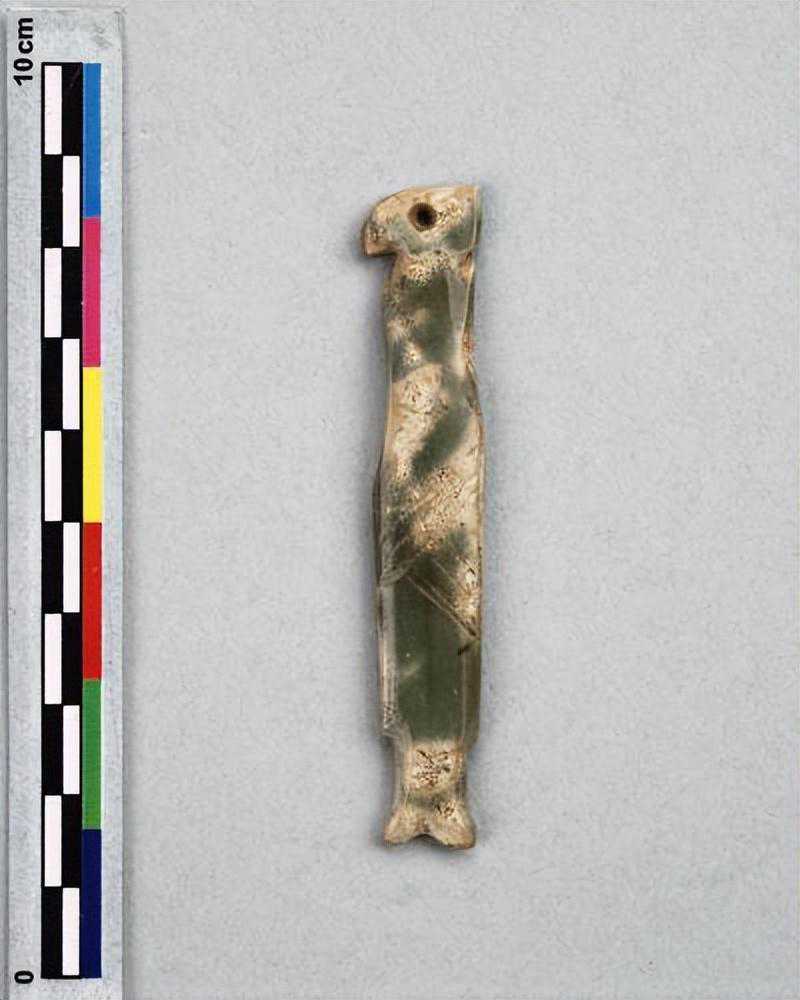 器为办圆形,刻为两鸟形,头部凸出,鼻特大而高,两目两耳分立两旁,下端为趾,作镂空状,耳、腹及趾旁又刻有细文,色淡绿。