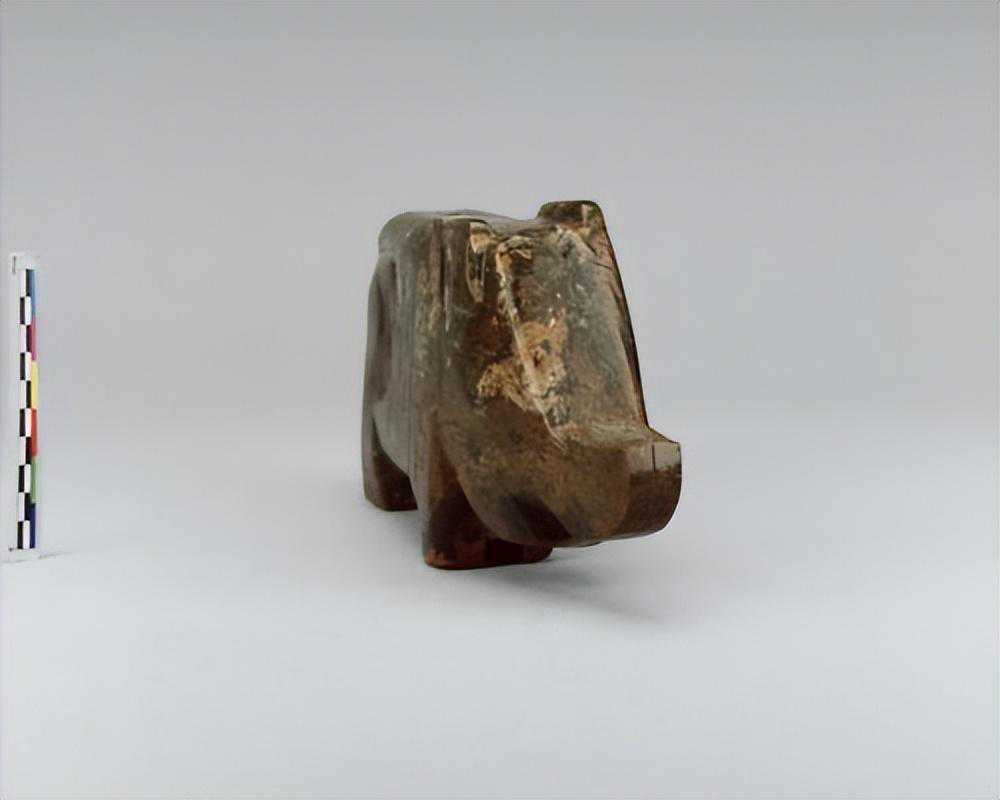 牛形立雕,口微张如一长条,头上两"臣"形眼,鼻刻为"()"形,眼后为一对弯角,曲伏于背上,表面上刻有简单文饰,下为两小耳,仅有阴纹表现,背部近平,四足略具形式,有短尾,色灰白。
