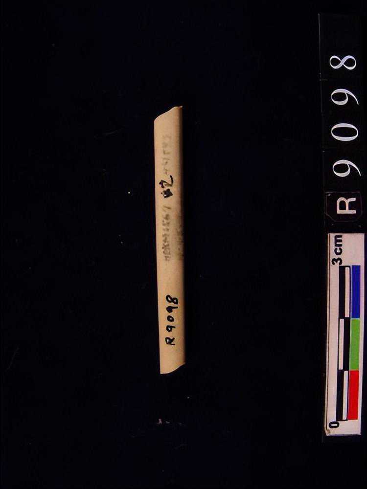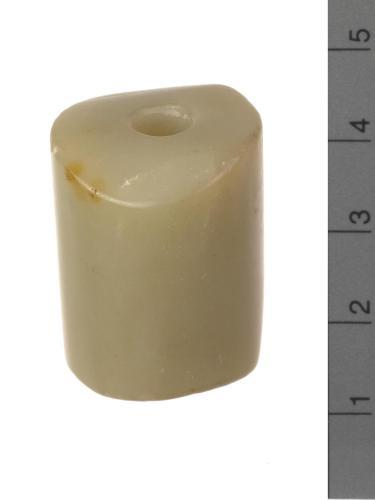 深灰色,带有棕色斑痕,全部磨制,部份沾有棕色土。顶端中拱,似一半圆形,由顶端下渐窄,至中腰又突起似一肩状。下段亦为圆柱,上有绳纹,末端亦为半圆球状。