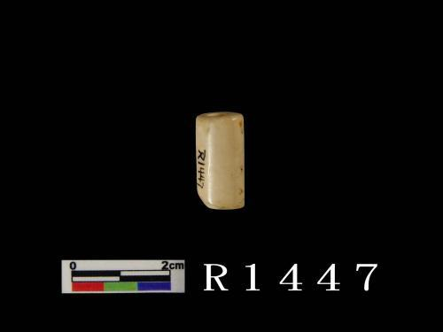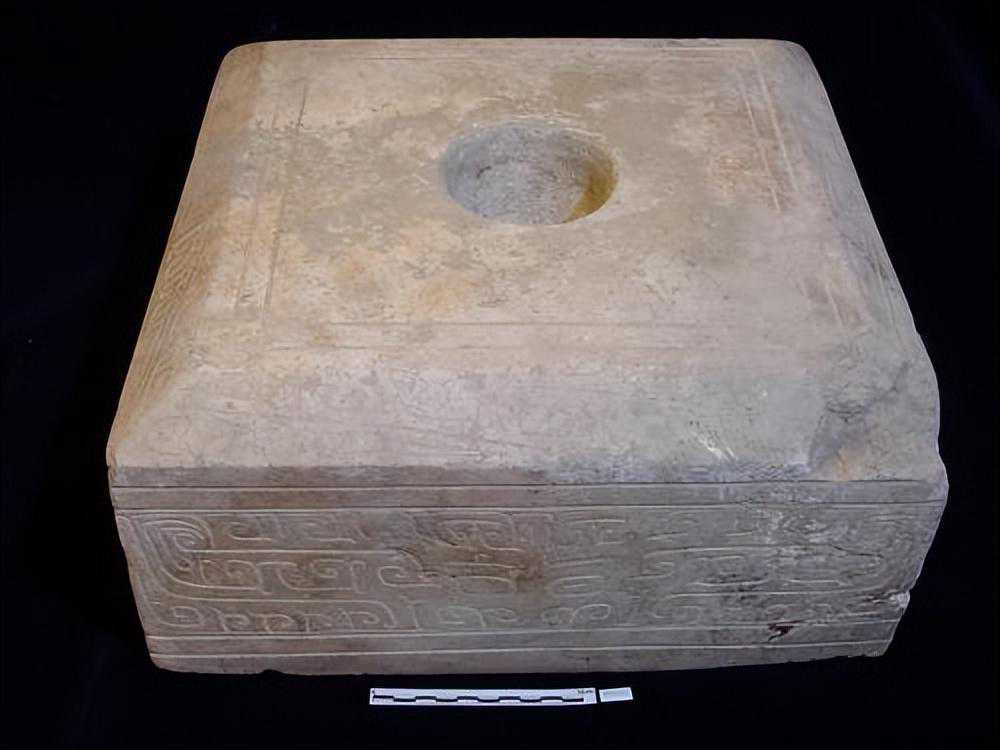 此器方柱状内呈圆筒形,柱中有凸起弦文四道,上下有花文,均阳纹,筒上亦有弦文一道。→色黄白。土中浸蚀过久,石质鬆坏甚多,如海棉。
