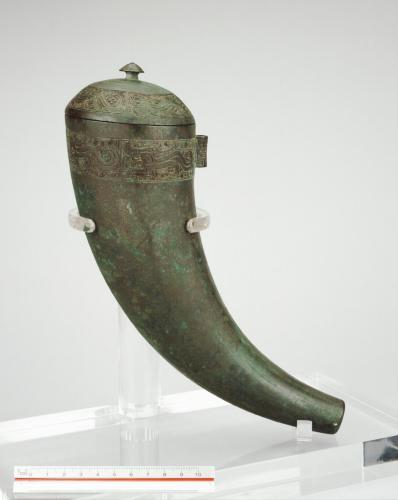 腹内正中有一圆柱,顶为六角花瓣形,中空下实,柱中部有四翘首蟠龙环绕二组,一为牛角一为茸形角,可以旋转,不明其用。外颈饰目雷纹,填以雷纹,两旁有耳为纽索形,其与腹接銲处作兽头形,另一耳似原来脱落又经接銲者,足部饰兽面一圈,凡三组。圈足有三十字孔。