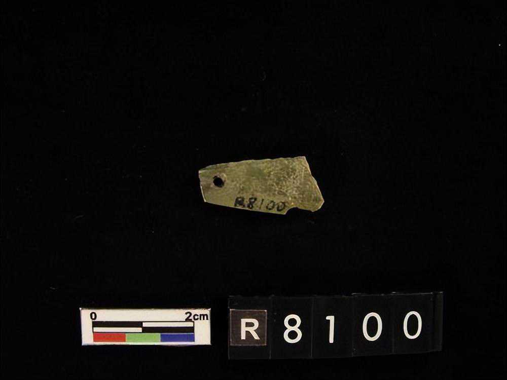 半圆形,一端残缺,一端有一小缺口,质极硬,色青绿