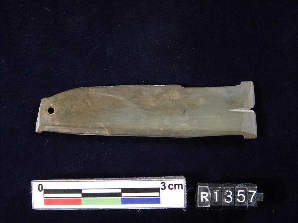 刃尖三角形,中有脊直达近柄处,中有一圆孔,无内,色青灰。