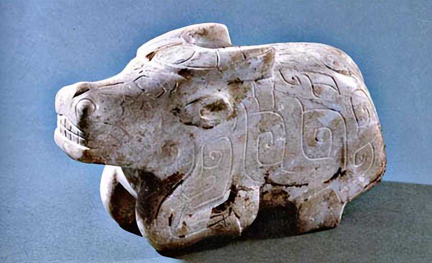 色灰白,虎形立雕,头部特大,口为一横长条,刻纹甚浅,上为弯鼻,其后为臣形眼,眼背之间耸立两耳,中有一缺口,背部凹下不平,腹下为一长形足,亦不平整,腹后部为一长尾。尾尖略翘起。