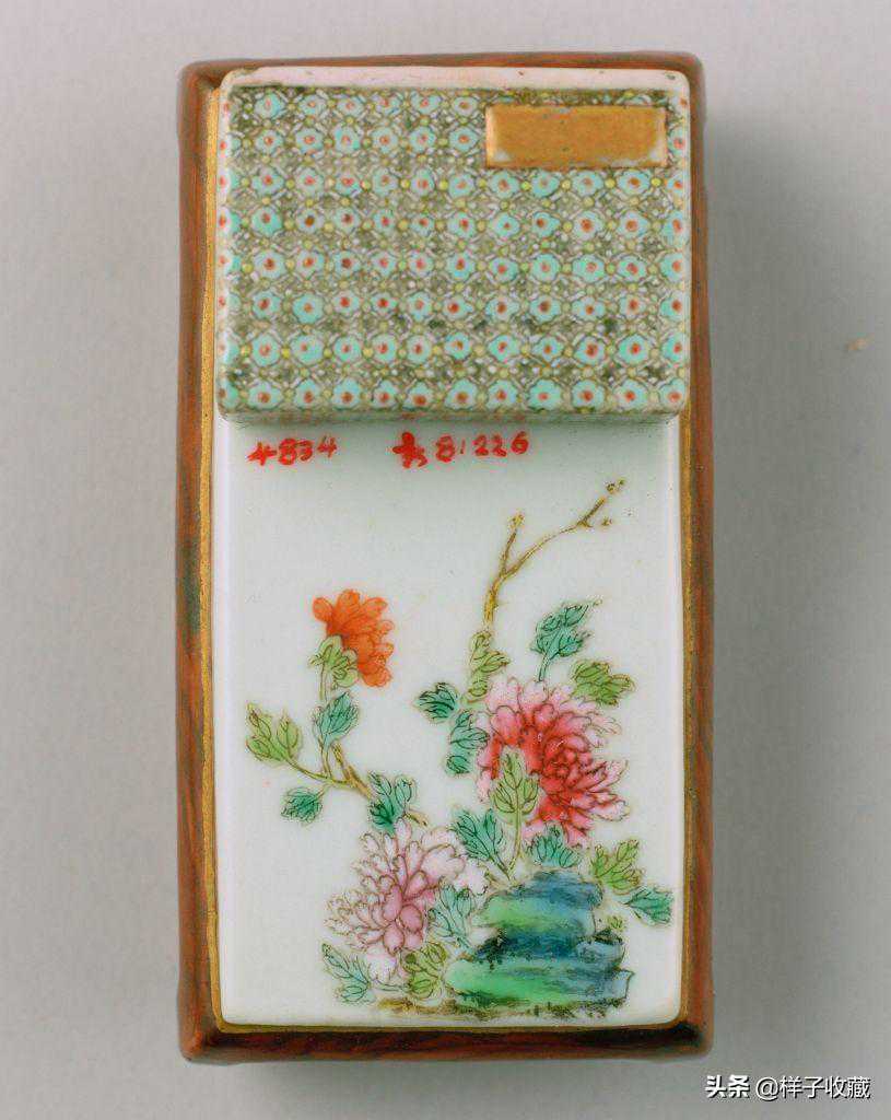 木纹釉粉彩牡丹纹书式墨床,清乾隆,高4.8厘米,长8.8厘米,宽4.2厘米。