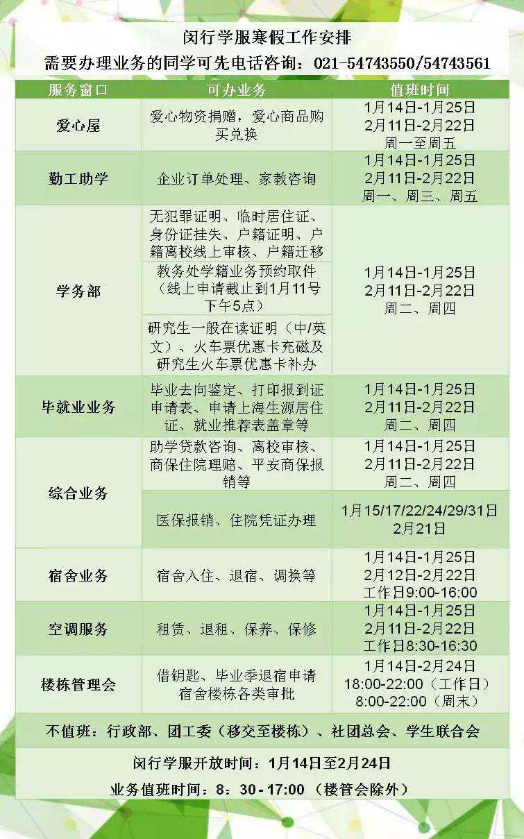 1月22日、1月29日、2月12日值班,服务时间:上午8:30-11:30,下午13:30-16:30,2月20日恢复正常。