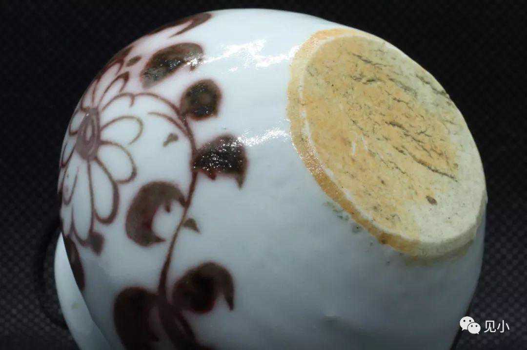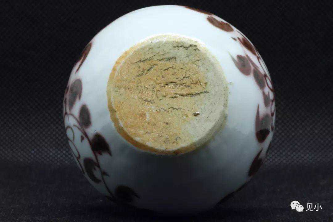 器身绘缠枝菊花纹,线条潇洒自然。釉里红发色鲜艳,具有元代釉里红的典型风格。