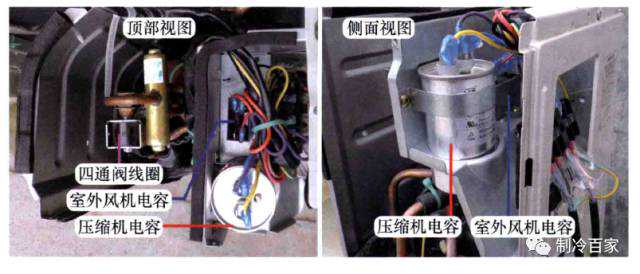压缩机和室外风机安装在室外机,因此压缩机电容和室外风机电容也安装在室外机,并且安装在室外机专门设计的电控盒内。
