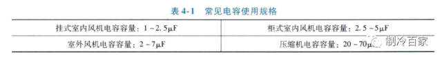 1)、容量:单位为微法(µF),由压缩机或室外风机的功率决定,即不同的功率选用不同容量的电容。常见参考下表: