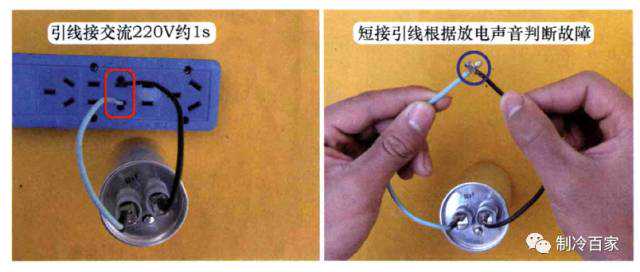 将电容的接线端子接上2根引线,通入交流电源(220V)约1s对电容充电,然后短接引线两端对电容放电。