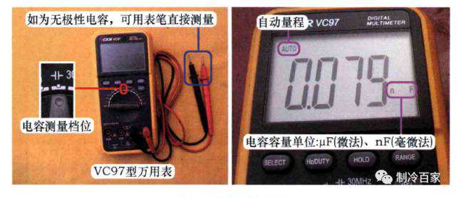 本例选用某品牌的VC97型万用表,最大检测容量200µF,特点是检测元极性电容时,使用万用表表笔就可以直接检测;而不像其他品牌或型号的部分万用表,需要将电容接上引线,再插入万用表专用的检测孔才能检测。