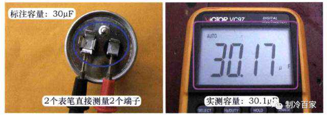 检测时将万用表拨到电容档,断开空调器电源,拔下压缩机电容的2组端子上引线,使用2个表笔直接测量2个端子,以标注容量30µF的电容为例,实测容量为30.17µF,说明被测电容正常。