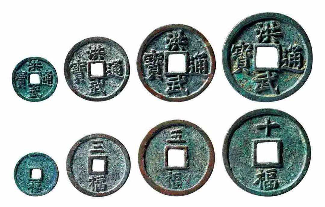 洪武元年(1368年)正月,朱元璋称帝,建立明朝,改元“洪武”,同年三月,开铸洪武通宝钱。明代钱文不称元宝,因为朱元璋的名字中有“元”字,要避讳,而且又要避讳元朝的“元”字,把所铸钱文一律叫通宝而不叫元宝,而不只是为避讳他自己的名字,所以自大中到永历,不论大小,都称通宝。