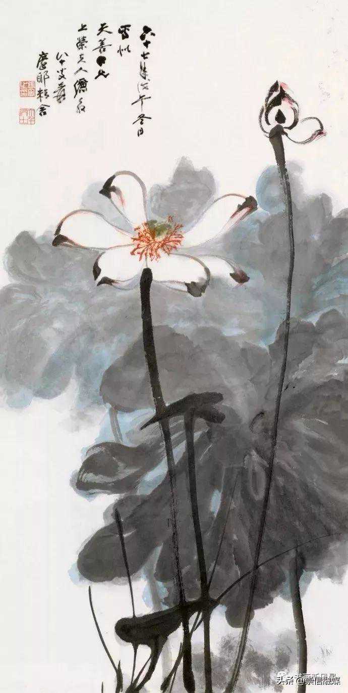 在笔墨上,张大千回归徐崇嗣没骨花卉风格,花茎清晰瘦长,不蔓不枝;荷花粉嫩出尘,香远益清;荷叶草草,墨晕流动而平衡,衬托出莲花亭亭净直的品质。整幅作品用色清雅,运笔灵活。位置经营得跌宕起伏却又平衡有致。