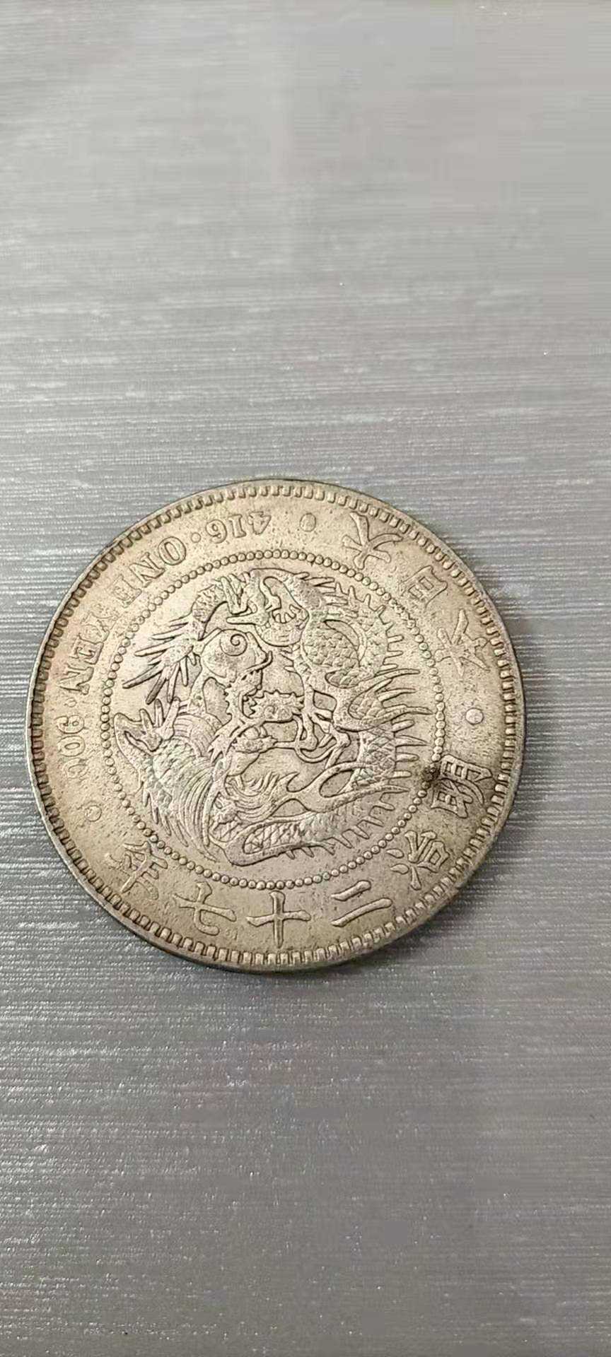 Therearedragonpatternsinthecenteroftheback,dragonpatterns,teethandclaws,glowering,phosphorusmustbevisible,lifelike,loweredge"GreatJapan·Meiji27years",upperedge"416·ONE·YEN·900".ThedragonpatternisdifferentfromthetraditionalChinesedragonpatternindetails,whichisdifferentfromthemajestyanddomineerconveyedbytheChinesedragonpattern,,highartisticvalue,exquisiteproduction,elegantpattern,beautifultext,richcontent,attractiveappearance,andhasacertainvaluepreservationandappreciationfunction.