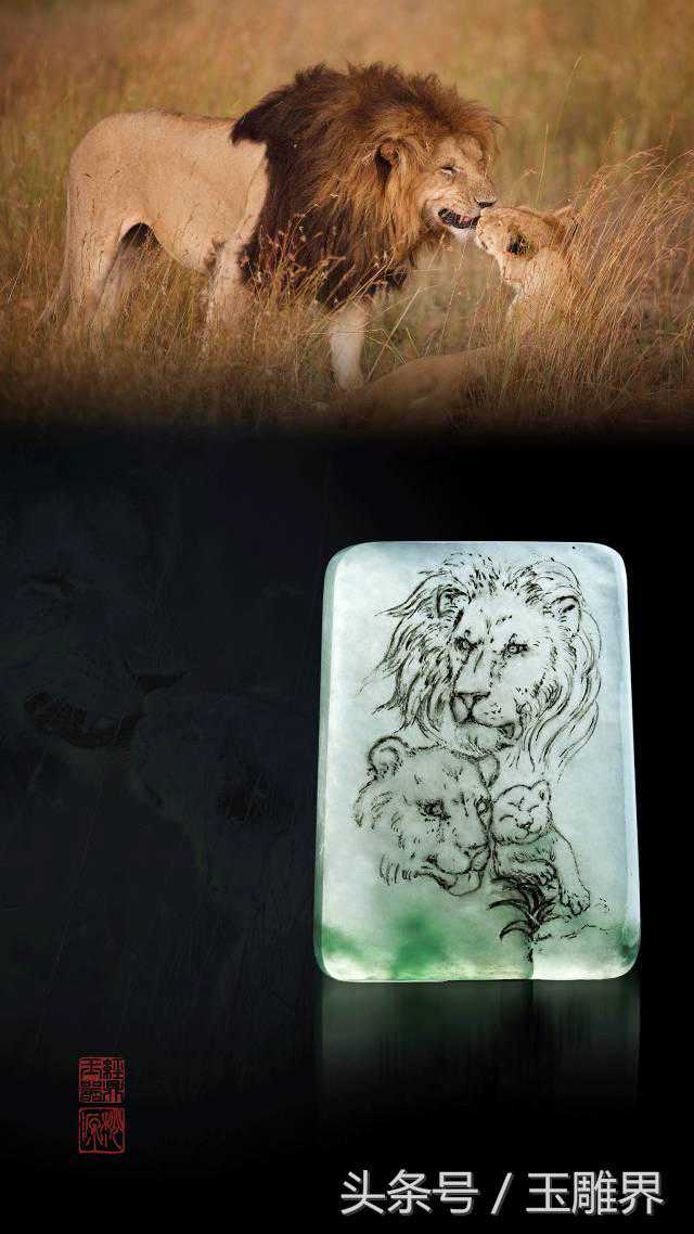 在底部翠绿轻染,上方冰清玉洁的玉质上,创造“草原之王”狮子一家三口之间爱与守护的温馨题材。雄狮居上头,睥睨远方、守护着妻儿;母狮满目柔光、看护幼崽;幼狮依偎母狮、睡梦酣甜。