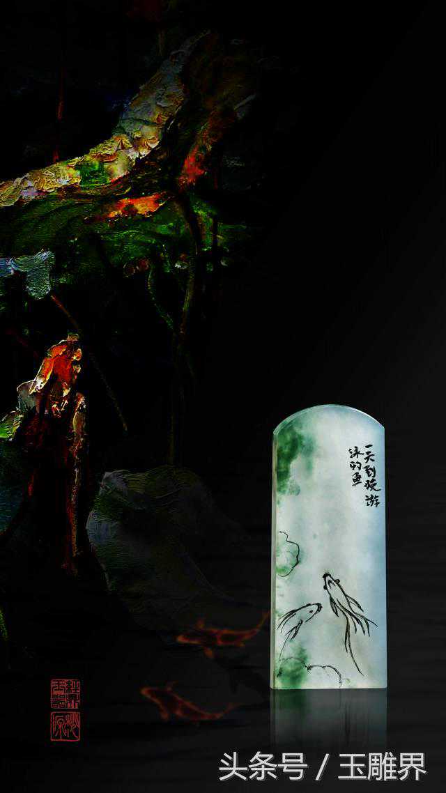 清莹玉质,柔润细腻,如冰雪凝成,浓郁飘花灵动中泅染着中国墨韵,两条轻灵自在的鱼儿,左右汇集游到一处,成双成对。想象可以多么美妙,尽管相思已望断秋水,却不妨碍“我”在画卷里,把“你”留在身旁,结伴同游。
