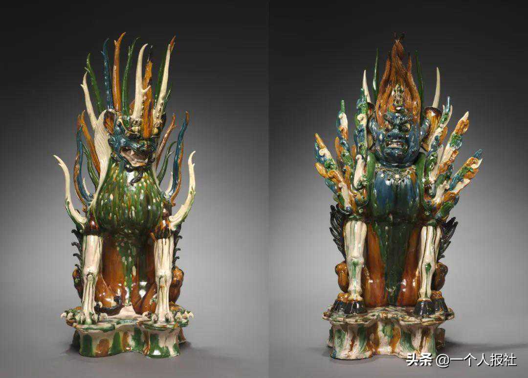 造型酷似青铜器,表面覆盖着一层薄薄的棕绿色釉。肩部三层纹饰中前两周为凤鸟纹,第三排的几何纹饰较为少见。早在商周时期(约公元前1600-256年),中国就有了高温烧造的带釉器物。随后陶工们获得了有关釉料中金属氧化物与窑气之间反应以改变釉料颜色的实用技术知识。