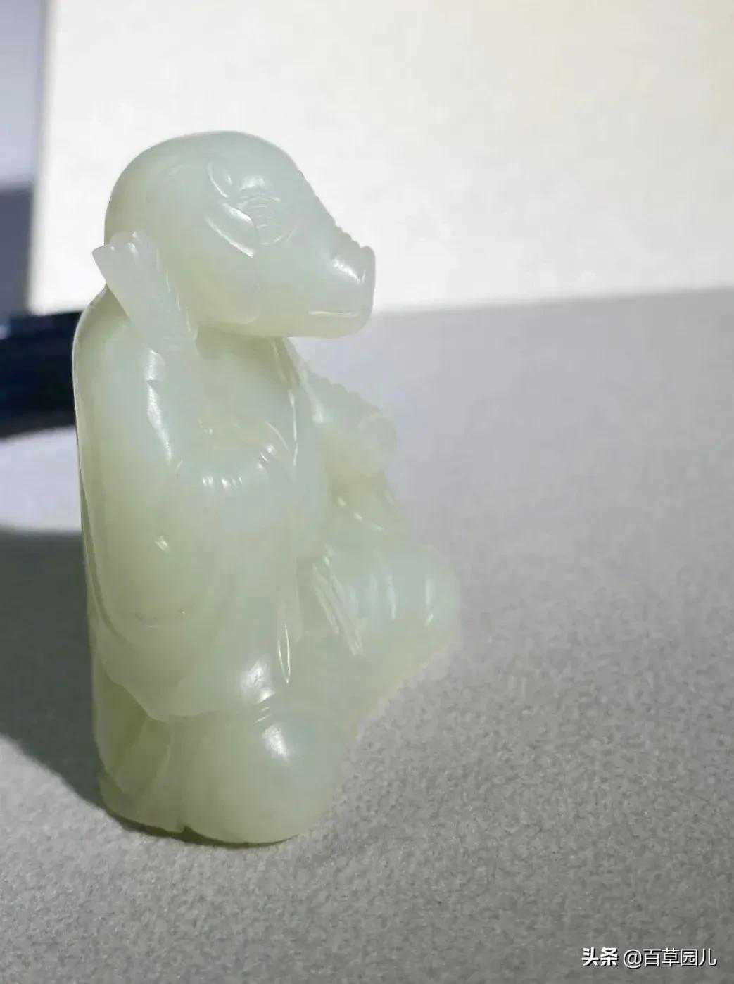 要说动物造型玉器,雕工惟妙惟俏,形神兼备外,再加上温润玉质的衬托,拿来作案头摆件或随身把玩、饰品等,都再好不过。下面我们就从这只玉猪猪看起吧:
