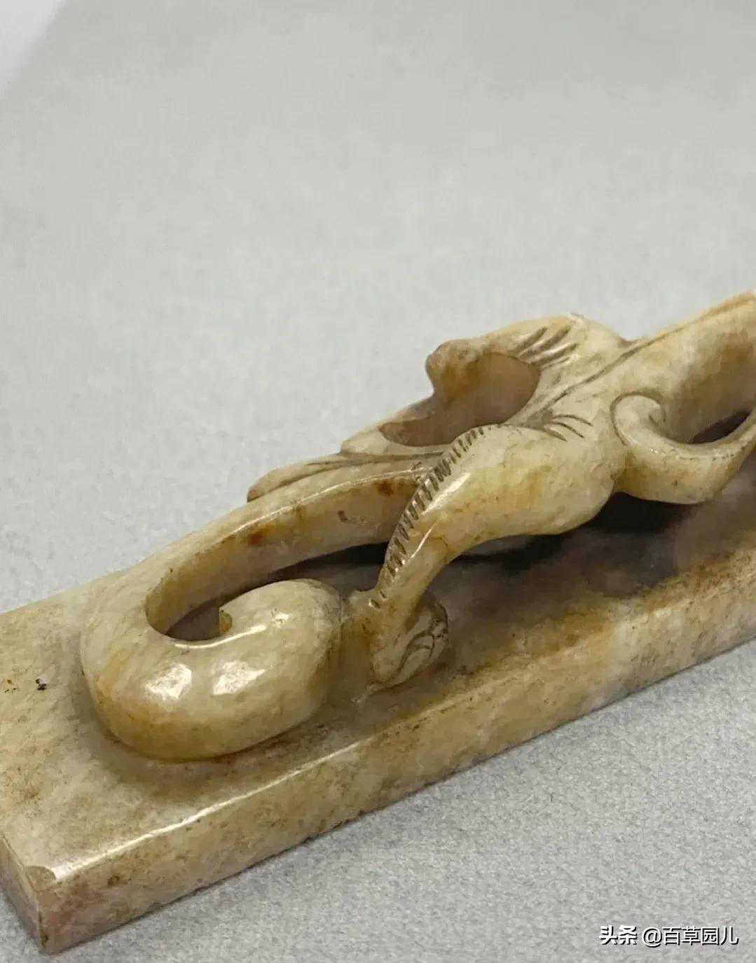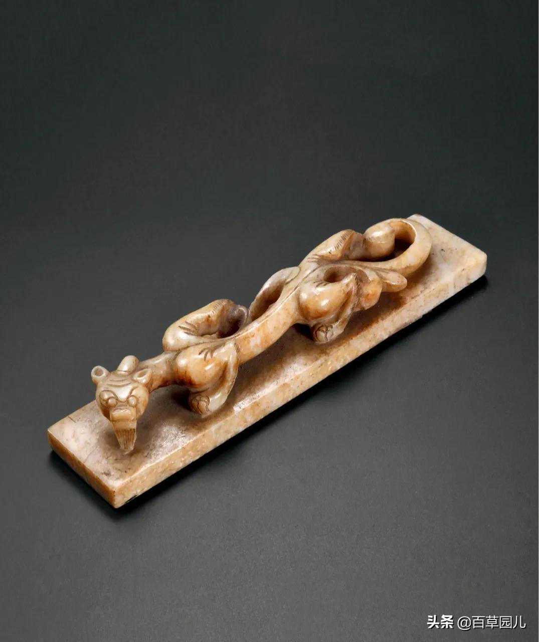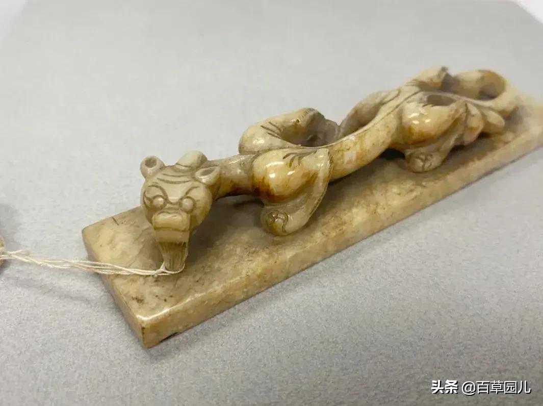 此带扣取龙首为形,玉质温润细腻,扣身雕刻变形兽面纹,和现在的皮带扣环相似。整扣雕琢简洁大方,自然流畅,尽显古代匠人超高手艺。