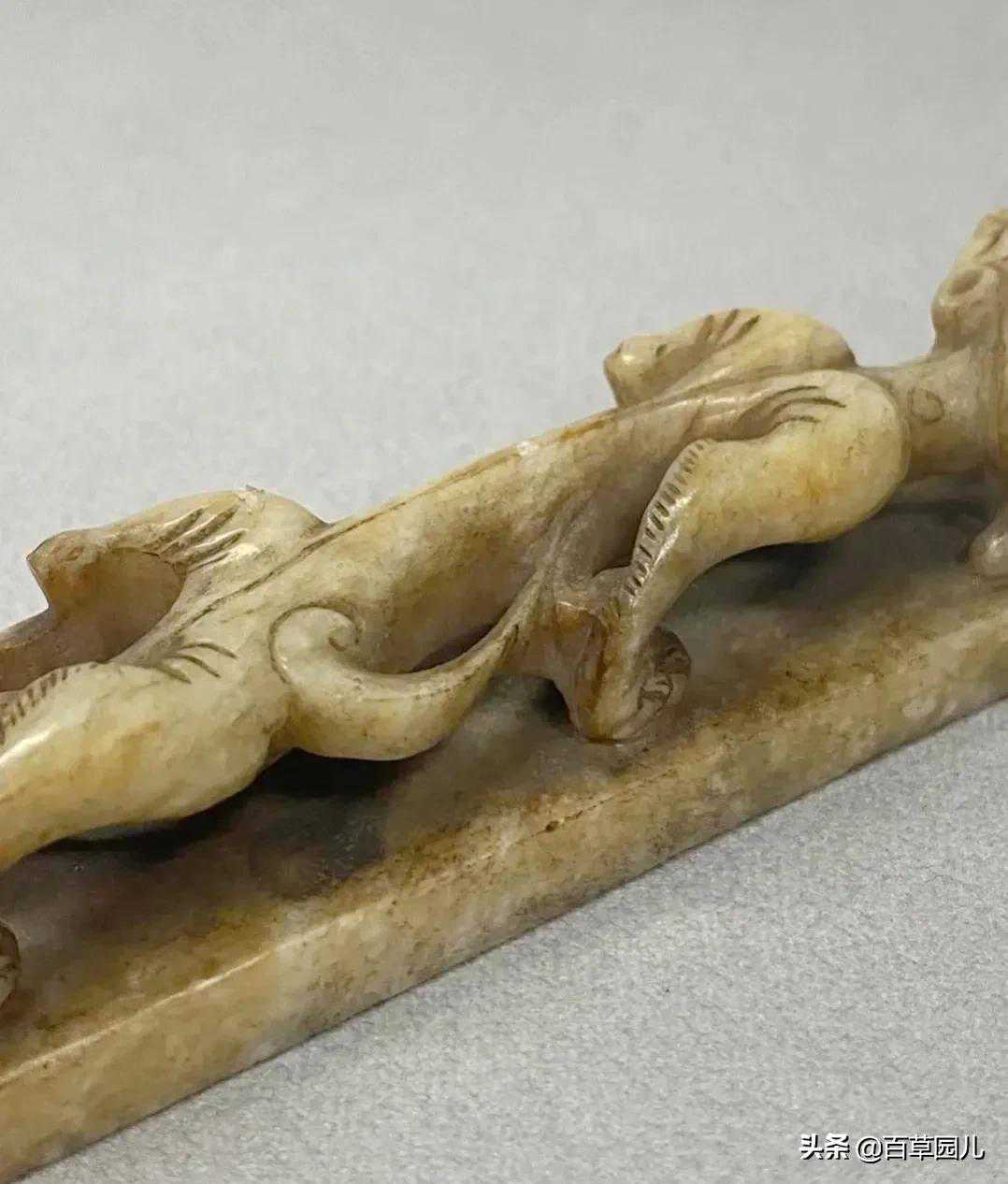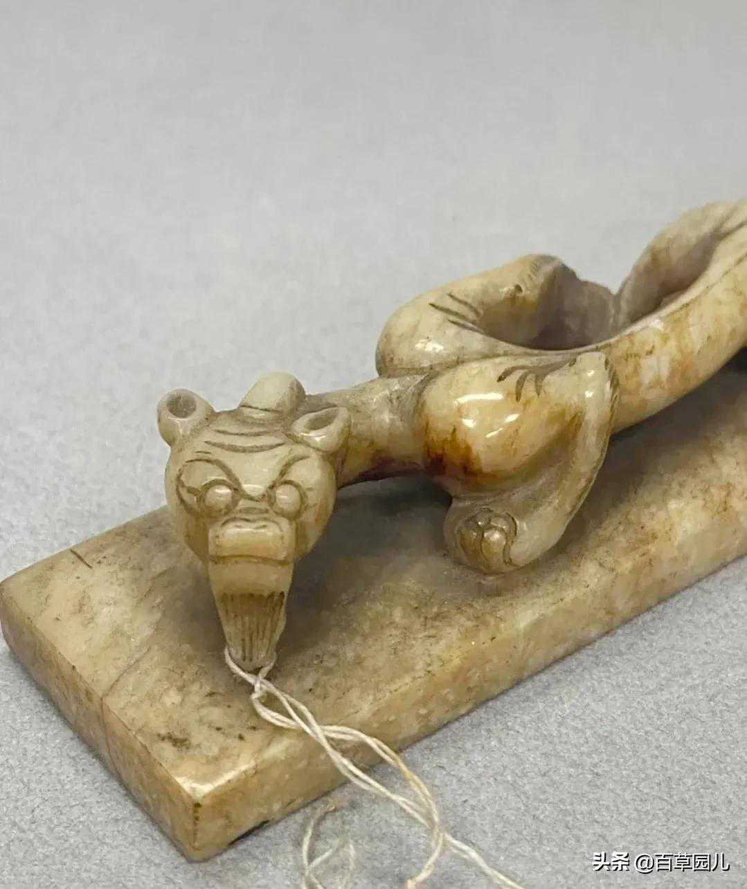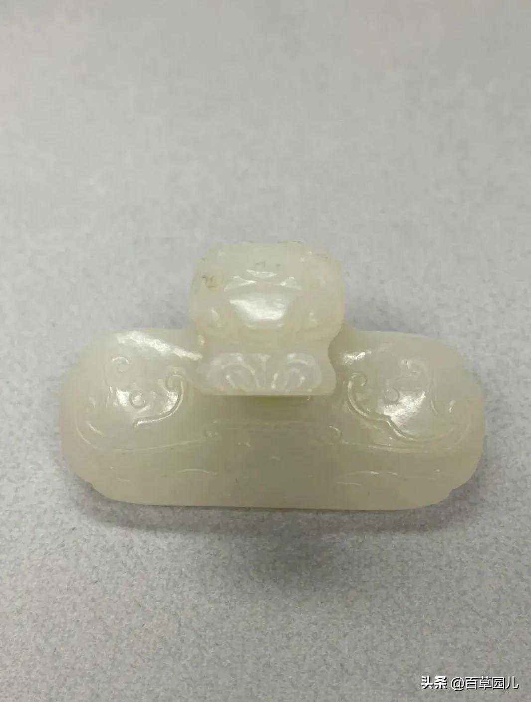 此带扣取龙首为形,玉质温润细腻,扣身雕刻变形兽面纹,和现在的皮带扣环相似。整扣雕琢简洁大方,自然流畅,尽显古代匠人超高手艺。