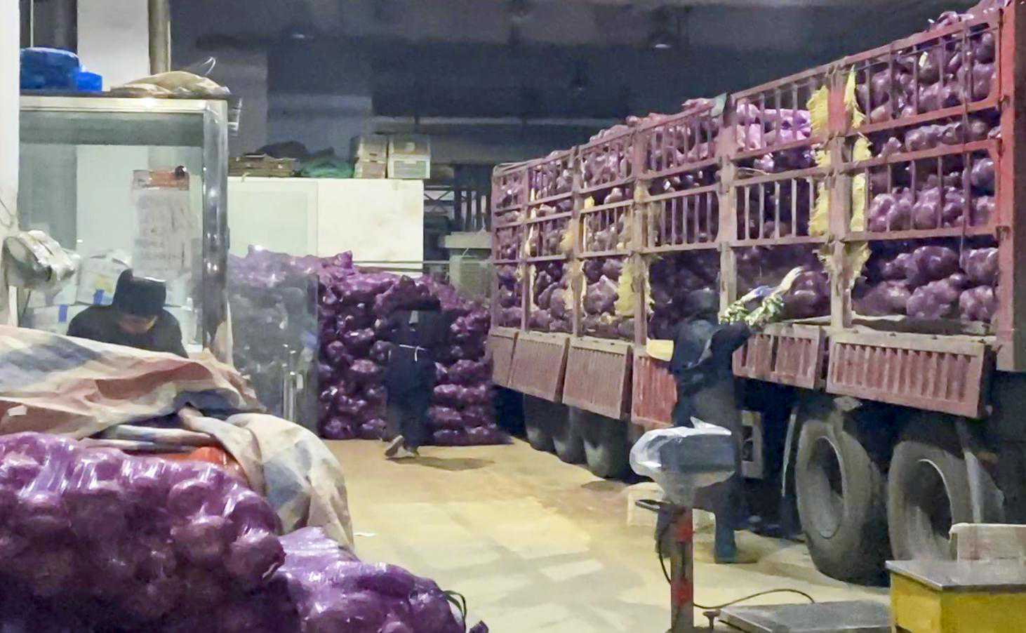 在蔬菜市场B321档口,一辆满载花菜的货车正在卸货,工作人员李汝芹按照客户需求,将花菜打包成每袋80斤左右。她告诉记者,花菜来自温州,一般是当天下午从温州装货出发,夜里即可到达南京。