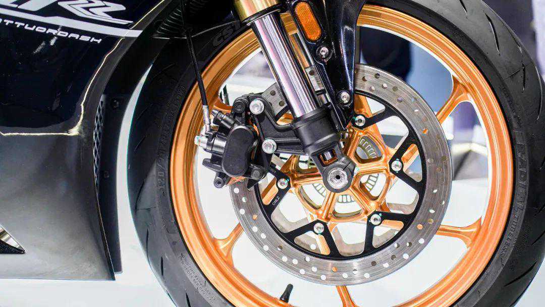 这前头的颜值虽说存在争议,但功能性很强,中间是一个冲压进气口,高速骑行时为发动机提供大量的新鲜空气,助发动机爆发更强动力。整车采用大量的轻量化设计,整备质量只有159kg。高配版的400RR还有碳纤维定风翼和更轻的全段钛合金排气,这在国产同级中很少见。